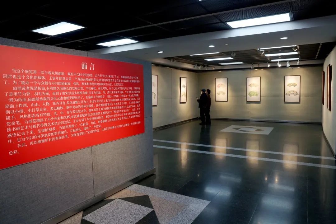 这次展览的主题是2022“视线里的美好生活”,在上海电视艺术家协会的支持下,对传统书画艺术与现代传媒艺术结合做了一次尝试,以视频记录和现场播放的形式,把部分书画家关于扇面书画创作的体会和感悟以视频形式记录下来,并同时在展厅播放,使得观众在扇面文化的“动静”之间,了解扇面发展脉络,领悟扇面文化内涵,也为传统的书画展增添了一点新意。