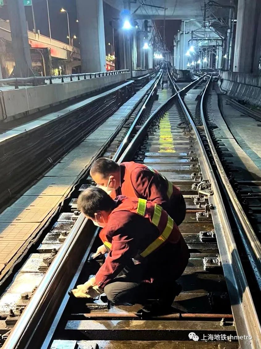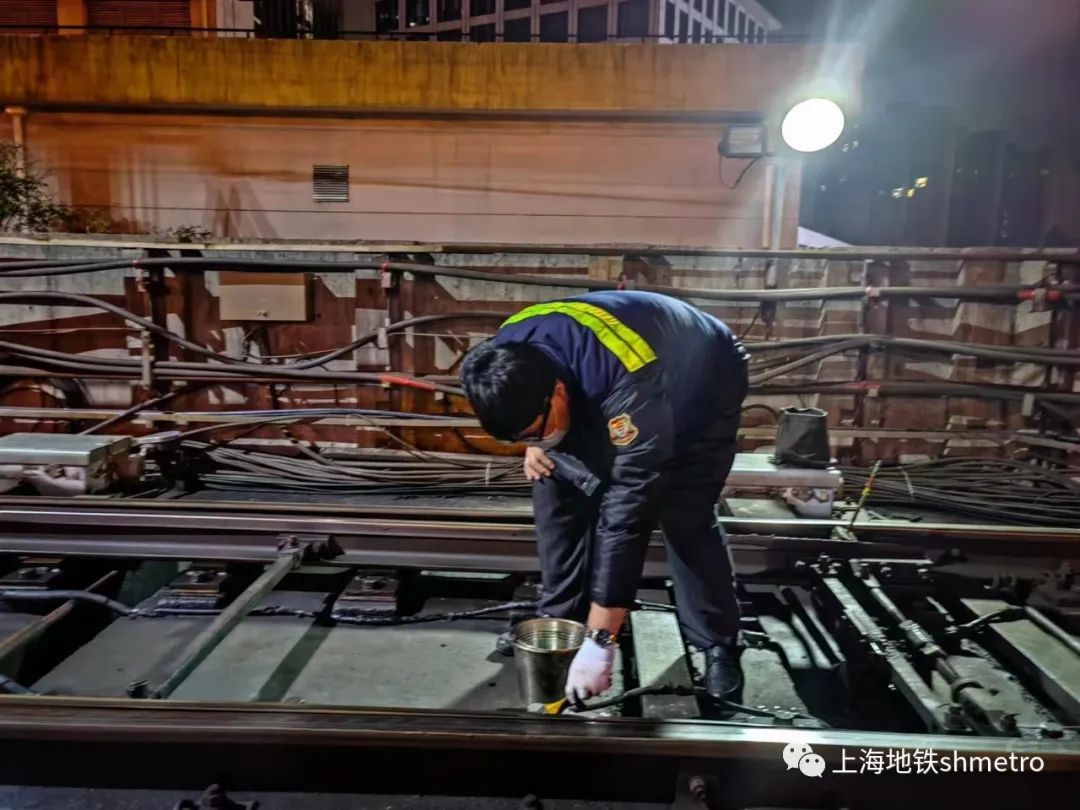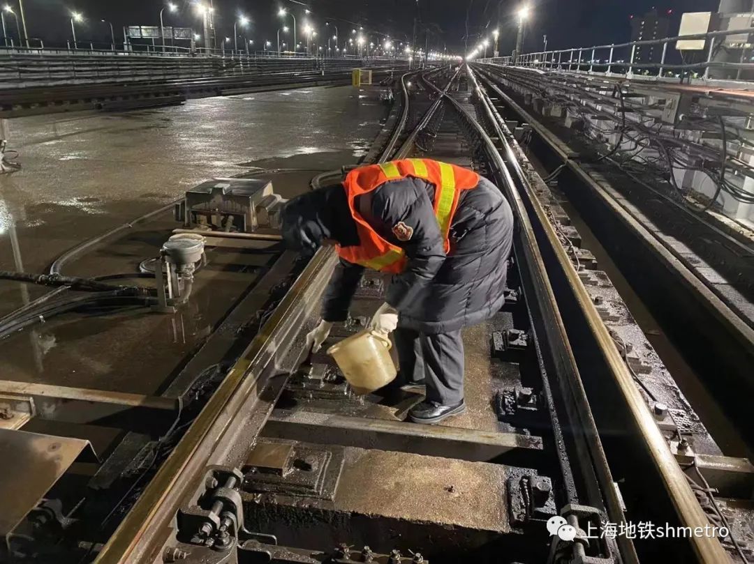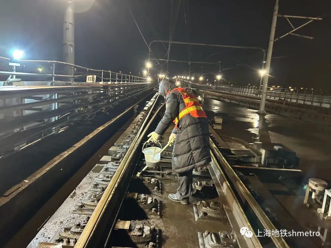 9号线九亭车场值班员进行道岔保养,采取提前涂抹防冻油等措施,保障严寒天气下设备的正常运行。