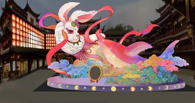 豫园外围同样新年氛围满满,校场街区选取沪上八景中位于老城厢的三景:凤楼远眺、黄浦秋涛、石梁月夜,力争复刻还原老城厢新年的景致;校场门头上,两只功夫兔正在对战,集装箱店铺周围也有兔子围绕观战,好不热闹。市民游客置身其中,感受老城厢繁华与喧闹,追忆故景绮梦。