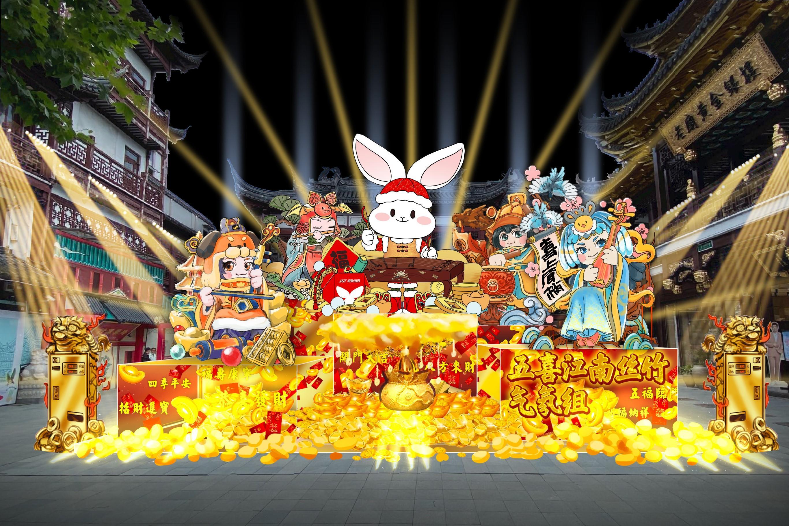 正章开篇,代表着“五福”的五种瑞兽兔子、喜鹊、狗、乌龟、蝙蝠现身黄金广场,组成五喜乐队,奏响安康喜乐。江南丝竹音乐缓缓流淌、声声入耳。舞台旁的金蟾兑币机,可随时扫码兑换许愿金币,接受现场点歌送祝福。舞台对面挂满祈福挂件的黄金树,承载着人们新春美好的祝福。迈入童涵春堂内,一只月宫玉兔专心致志地捣药,上演玉兔捣药的经典神话故事,与童涵春堂这座百年老店相得益彰,献上健康与长寿的祝福。