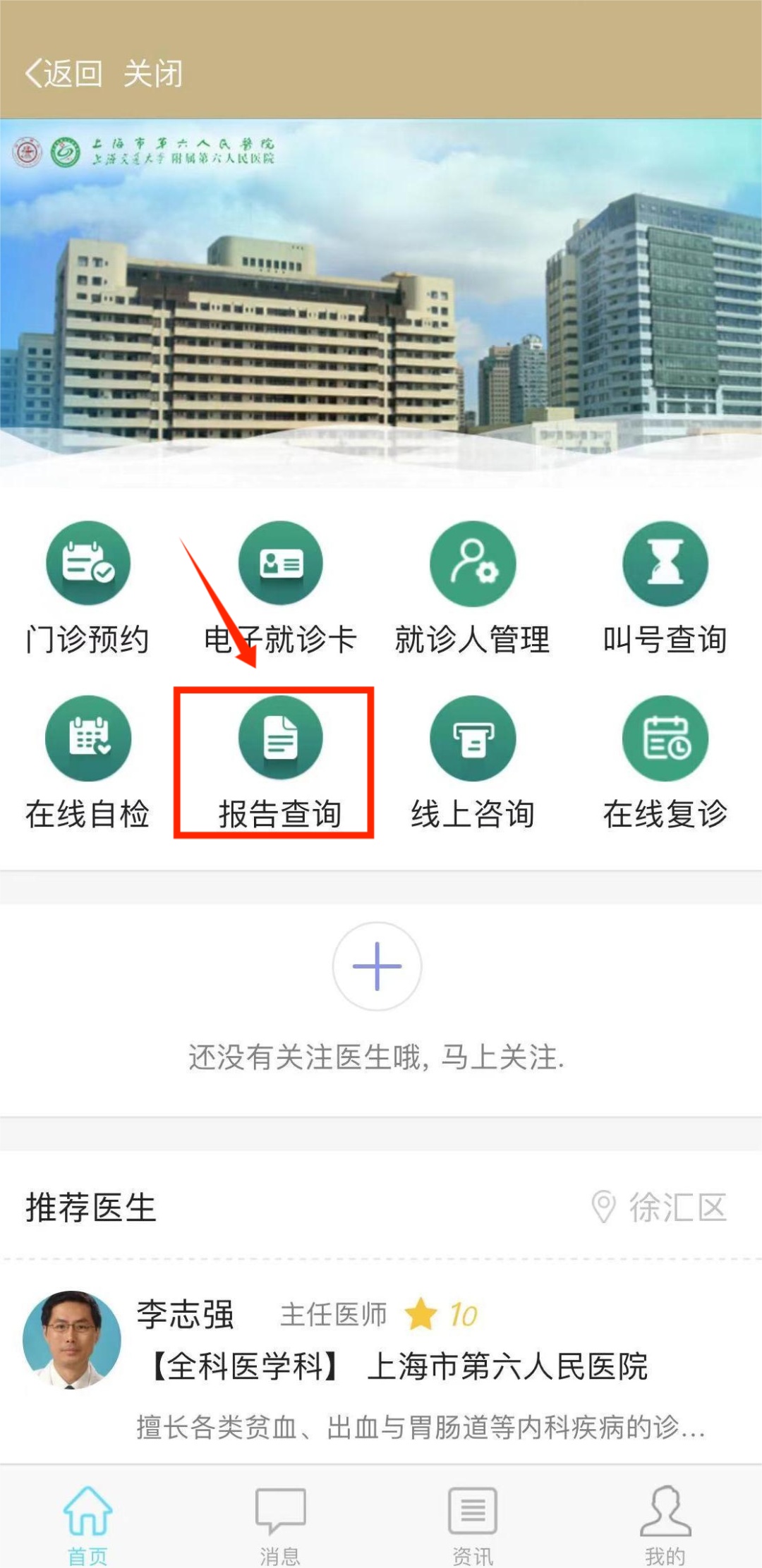 点击“互联网医院”首页上的报告查询服务,即可在互联网医院中线上查询相关医疗报告。