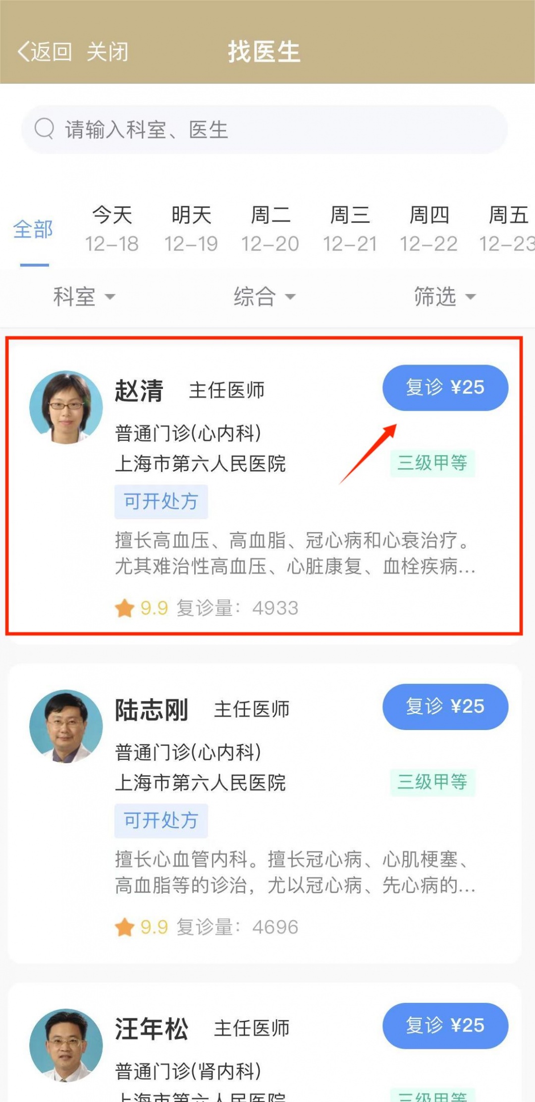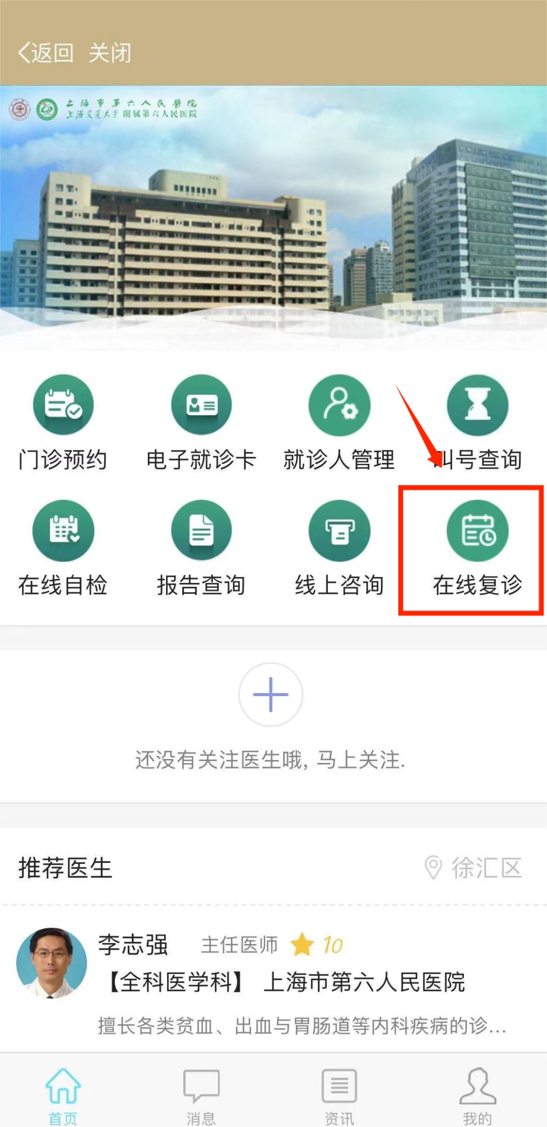 点击“互联网医院”首页上的在线复诊服务,选择复诊日期、医生支付复诊费用,即可享受在线复诊服务。