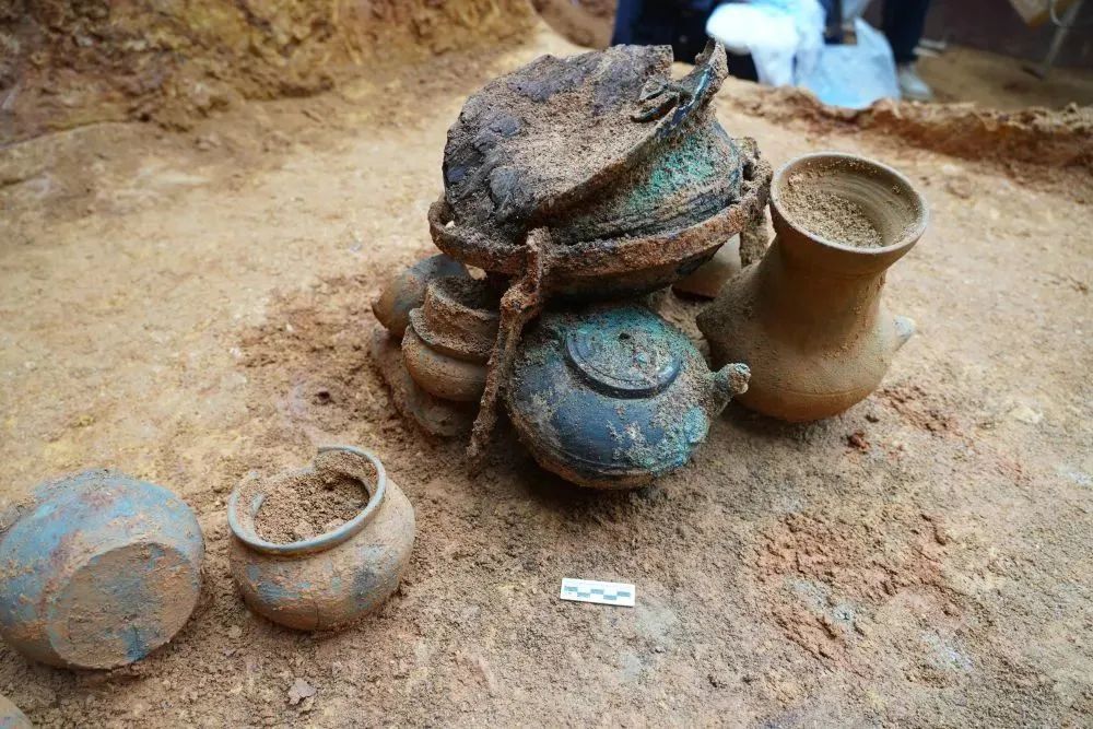 图为墓葬中出土的铜釜及鐎壶。图片由湖南省文物考古研究院提供