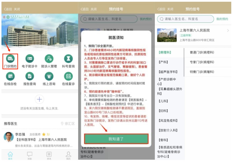点击“互联网医院”首页上的门诊预约服务,选择所需要预约的科室即可完成线上预约。