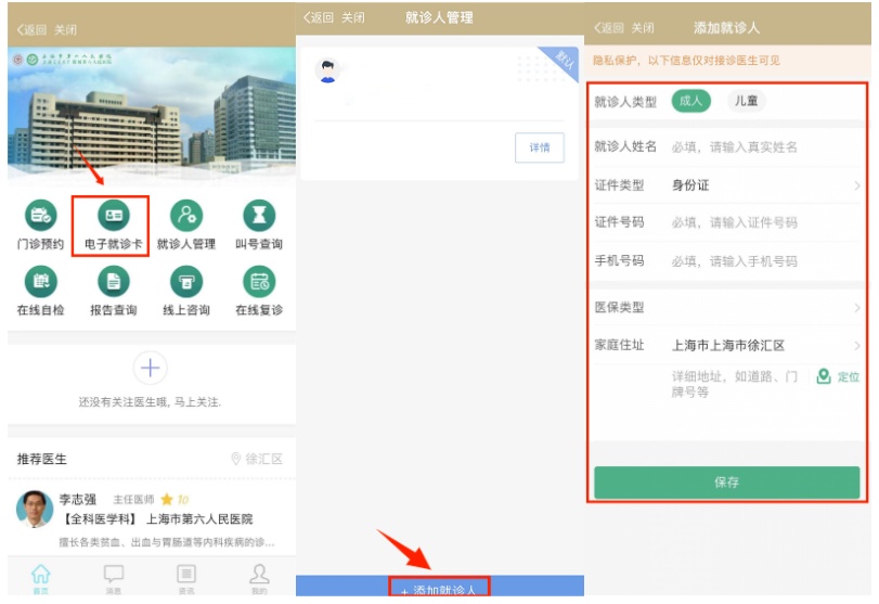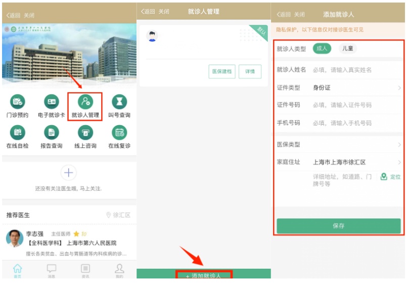 点击“互联网医院”首页上的就诊人管理服务,即可添加/删除就诊人员。