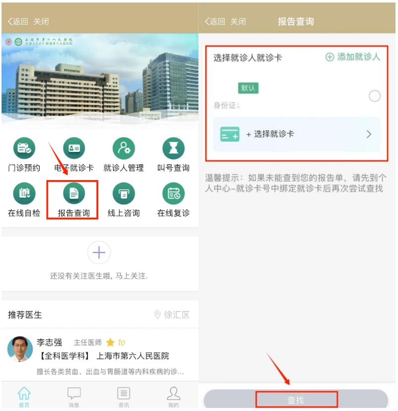 点击“互联网医院”首页上的报告查询服务,即可在互联网医院中线上查询相关医疗报告。