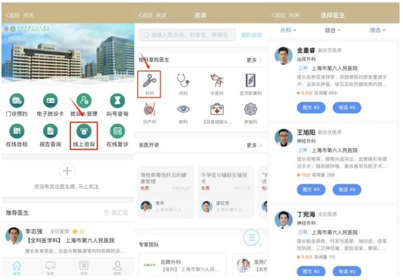 点击“互联网医院”首页上的线上咨询服务,选择需要咨询的医疗科室、医生即可线上图文/电话咨询。