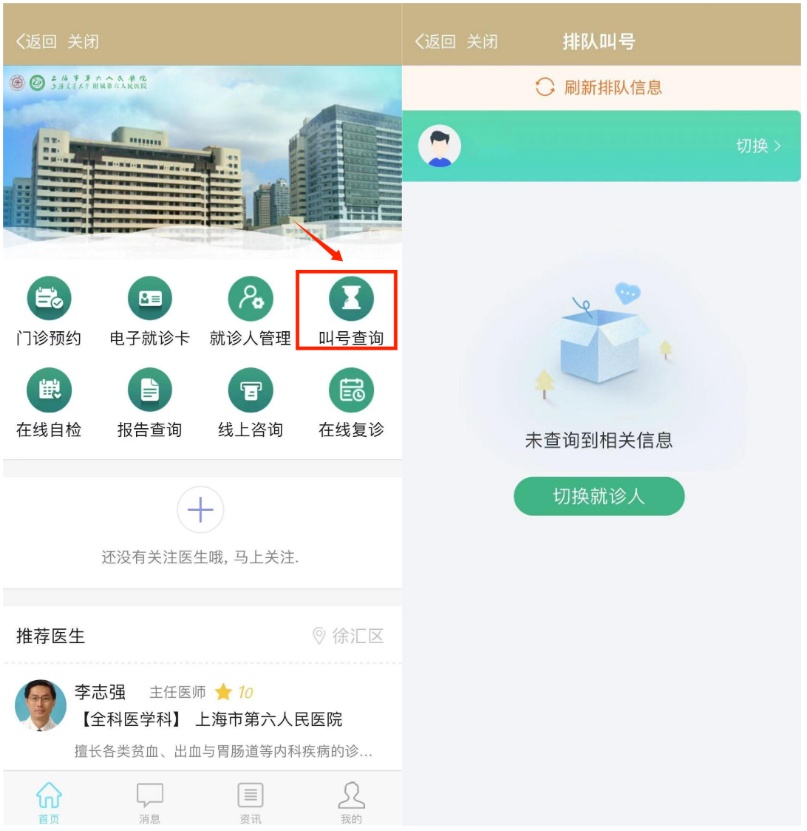 点击“互联网医院”首页上的叫号查询服务,即可在移动端线上查看排队名次。