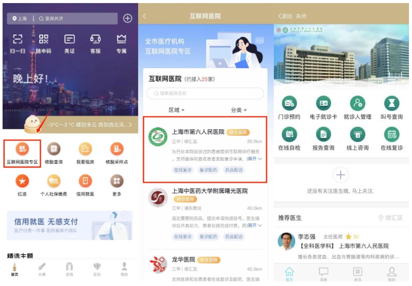 打开“随申办”APP或微信、支付宝小程序,在首页中找到“互联网医院”服务运营,点击进入即可选择所在辖区内“互联网医院”。