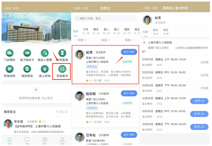点击“互联网医院”首页上的在线复诊服务,选择复诊日期、医生支付复诊费用,即可享受在线复诊服务。