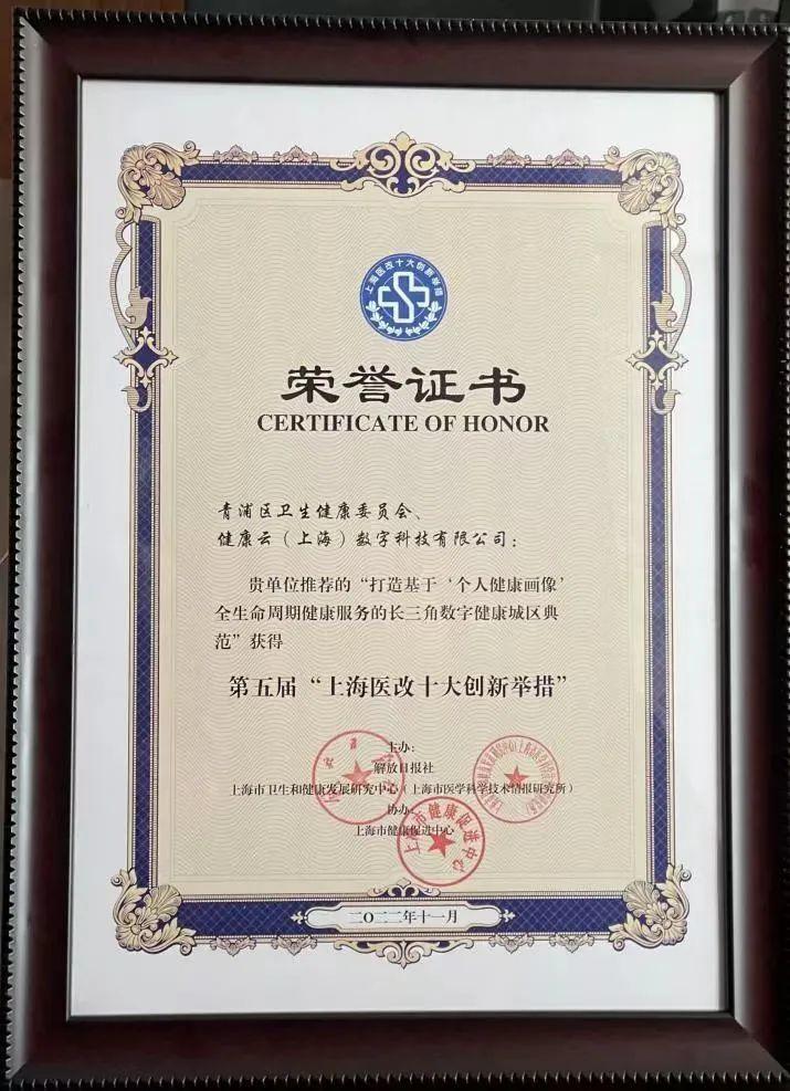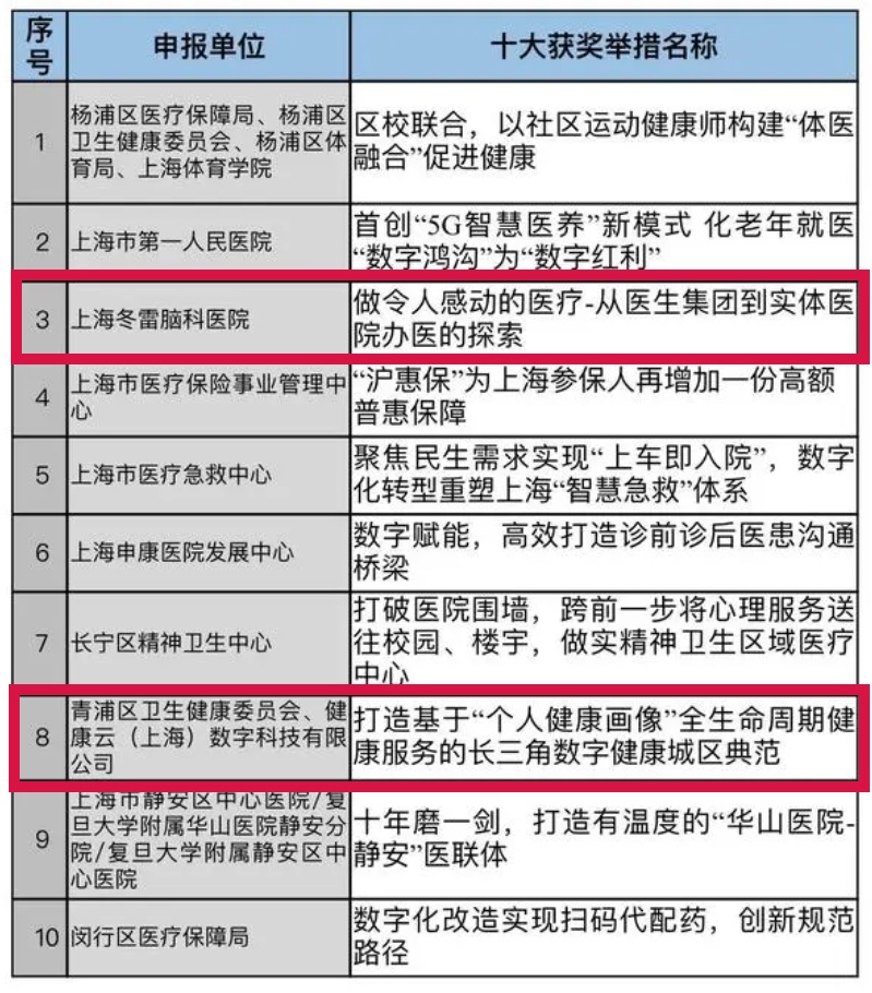 近日,第五届“上海医改十大创新举措”揭晓。其中,青浦区卫生健康委员会、健康云(上海)数字科技有限公司申报的“打造基于‘个人健康画像’全生命周期健康服务的长三角数字健康城区典范”,上海冬雷脑科医院申报的“做令人感动的医疗-从医生集团到实体医院办医的探索”成功入选。