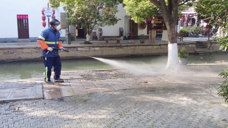 作为人员流动高密集区域,朱家角古镇景区高度重视环境消杀工作。在古镇景区东井街,记者看到,随着客流量的增加,各类生活垃圾增多,保洁人员对垃圾桶内胆外壳细致地擦拭,并用高压水枪冲洗路面。对于景区内的公共厕所,保洁人员继续坚持“一客一保洁”的原则,对公厕的门把手、水龙头、洗手池等重点部位开展预防消毒作业。负责垃圾收运的环卫工人做好对商户常态化垃圾收运工作的同时,全时段对景区路面清扫。大家分工有序,按照不同岗位、不同区域,分时段、分重点地对古镇景区环境进行消杀清洁作业。