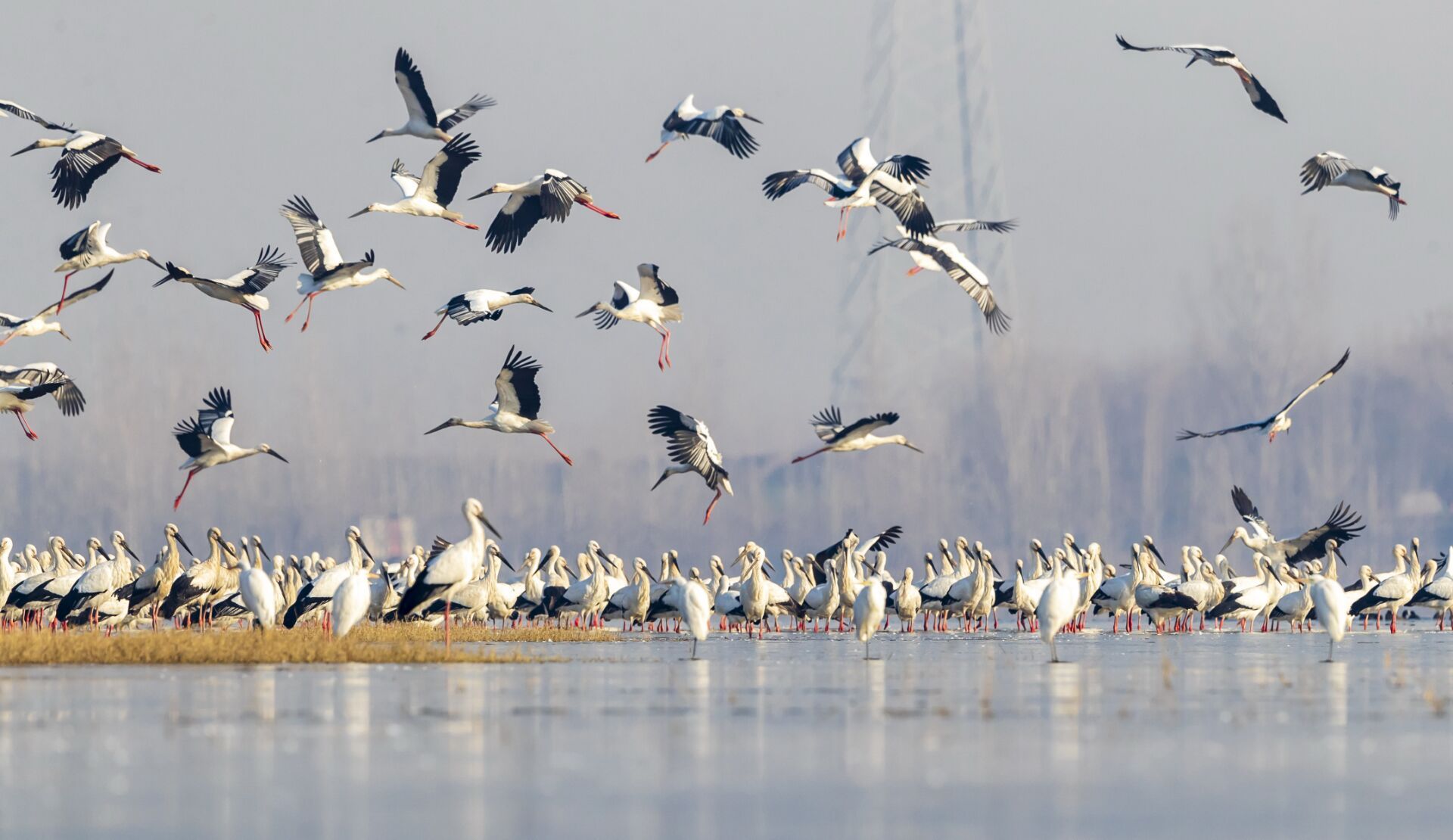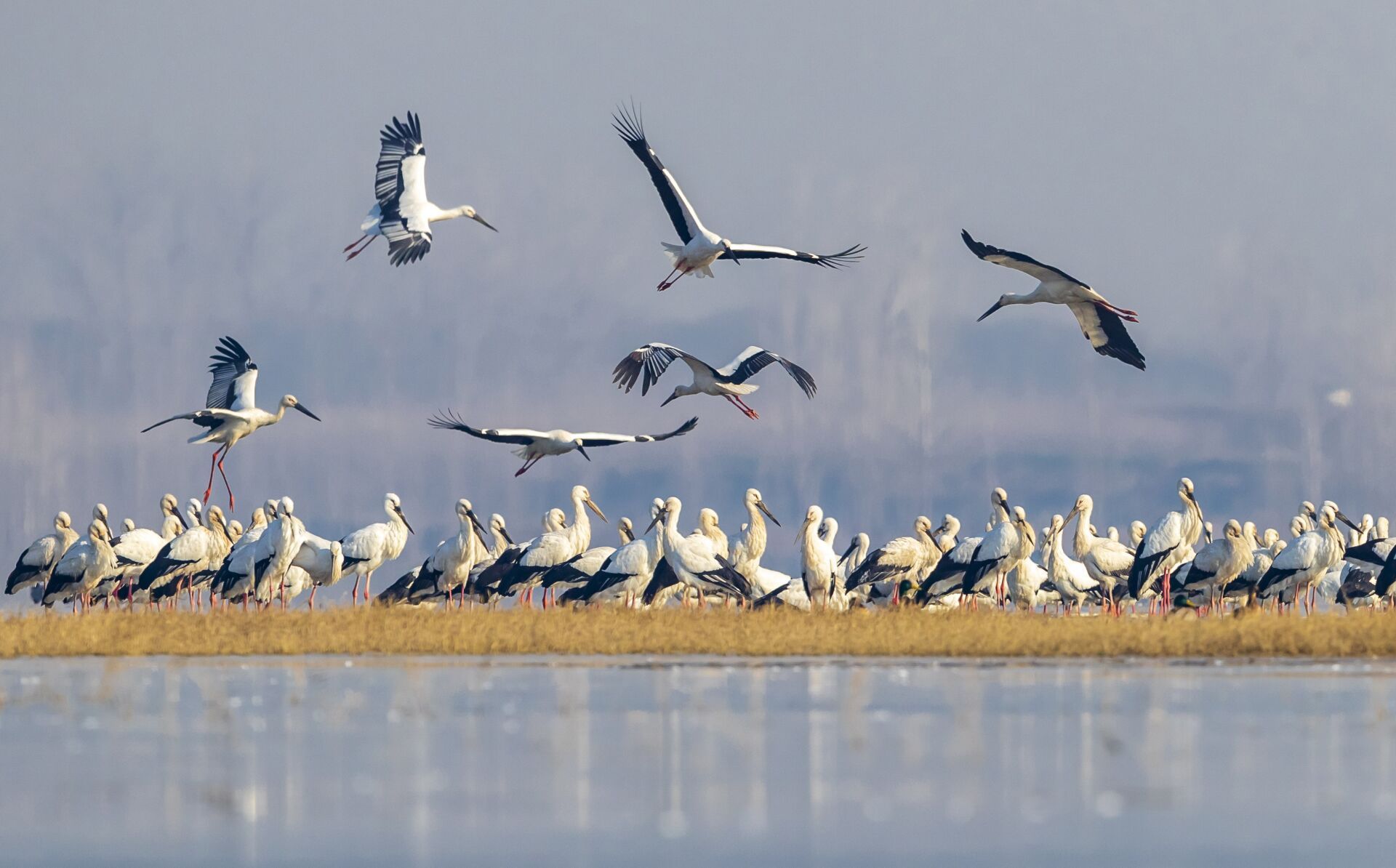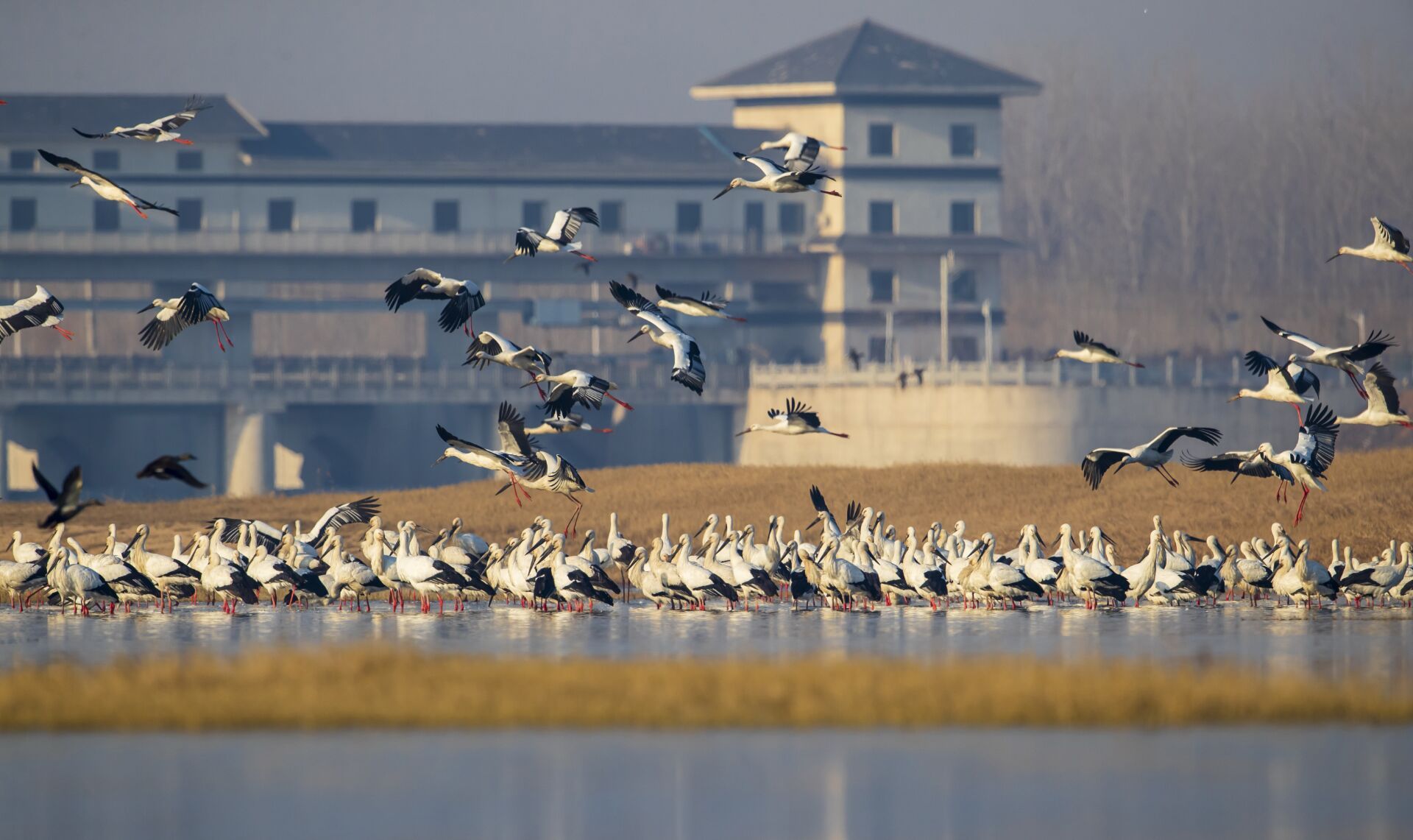 近日,数百只东方白鹳飞临沂河临沂市郯城县河段越冬,给平静优美的河滩增添了一道灵动的生态风景。东方白鹳是国家一级保护动物,是一种珍稀候鸟,有“鸟界国宝、鸟类大熊猫”之称。常在河流、沼泽、湿地涉水觅食,主要以小鱼、蛙、昆虫等为食。