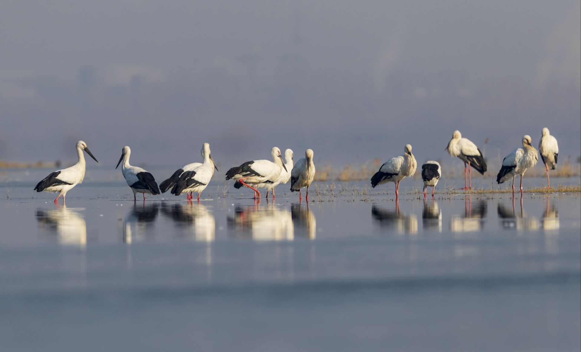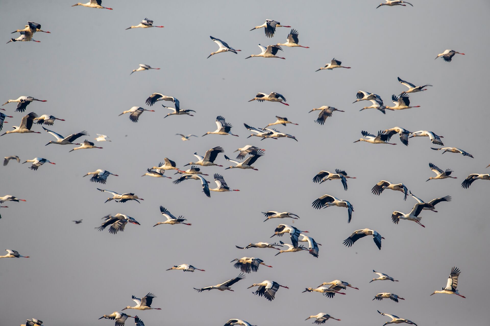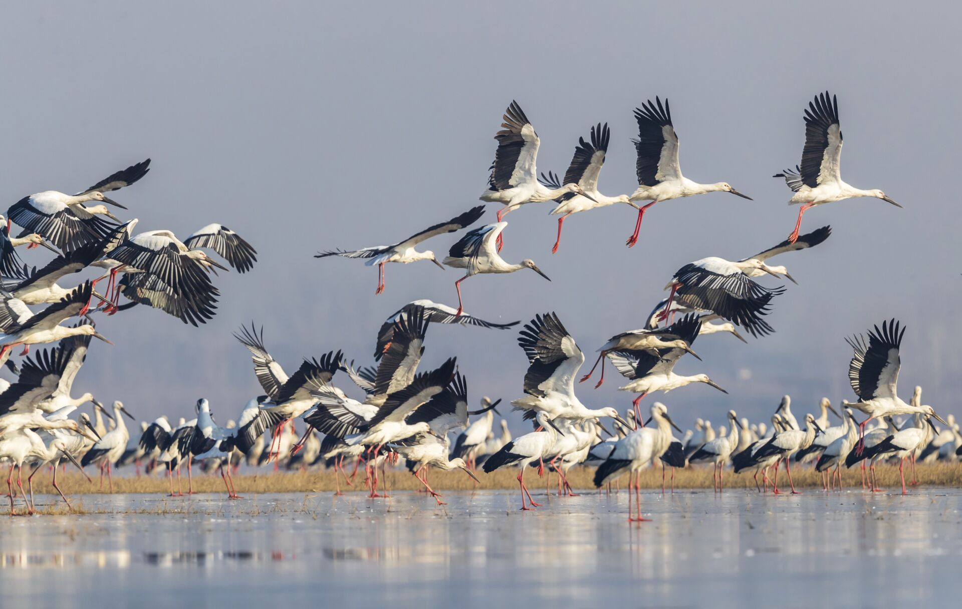 近日,数百只东方白鹳飞临沂河临沂市郯城县河段越冬,给平静优美的河滩增添了一道灵动的生态风景。东方白鹳是国家一级保护动物,是一种珍稀候鸟,有“鸟界国宝、鸟类大熊猫”之称。常在河流、沼泽、湿地涉水觅食,主要以小鱼、蛙、昆虫等为食。