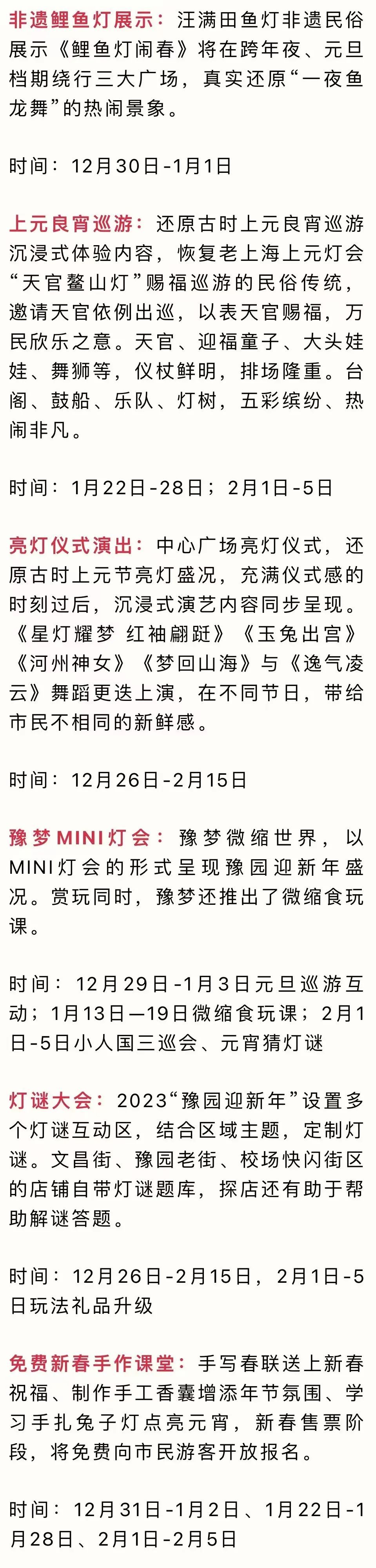 在元旦、春节、元宵三大新春节日期间,豫园的演艺内容更为丰富。汪满田鱼灯非遗民俗展示《鲤鱼灯闹春》将在跨年夜、元旦档期绕行三大广场,真实还原“一夜鱼龙舞”的热闹景象。