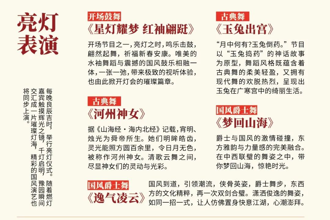伴随 “玉兔东升、鲲鹏万里”主灯组被点亮,沉浸式演艺内容同步呈现。以舞蹈《星灯耀梦 红袖翩跹》开启亮灯仪式的演艺内容,具象化呈现《玉兔出宫》的绮丽生活;两位《河州神女》宵明与烛光降临,素衣荷裳,如云梦般空灵;《梦回山海》与《逸气凌云》带给市民美轮美奂的视觉享受。