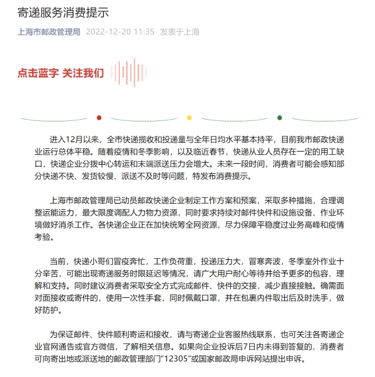 上海市邮政管理局发布消费提示:进入12月以来,全市快递揽收和投递量与全年日均水平基本持平,目前我市邮政快递业运行总体平稳。随着疫情和冬季影响,以及临近春节,快递从业人员存在一定的用工缺口,快递企业分拨中心转运和末端派送压力会增大。未来一段时间,消费者可能会感知部分快递不快、发货较慢、派送不及时等问题,特发布消费提示。