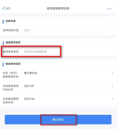 1. 继续教育类型分为“学历(学位)继续教育”和“职业资格继续教育”,修改时无法修改继续教育类型,如发生不同类型的继续教育请重新添加一条专项附加扣除记录。