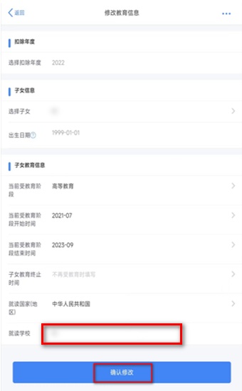 1. 子女受教育阶段发生变化的需要新增一条子女教育专项附加扣除信息,切勿修改或删除以前阶段信息。