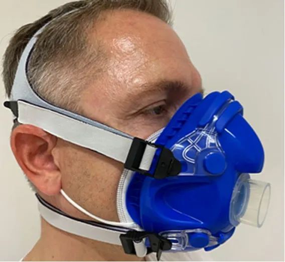 国外曾有学者通过心肺运动试验来研究佩戴不同口罩对心肺功能的影响。心肺运动试验是一种临床上常用的评估人体心肺功能的测试,主要考察人体静息和运动负荷状态下心电图、血压的变化,以及肺通气、摄氧量、二氧化碳排出量等代谢指标,综合评价心肺的协调功能。(如图,蓝色面罩为检测装置)