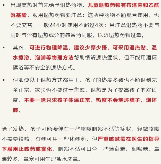 儿童发热往往比成人发热的体温更高,但恢复比成人要快,一般儿童感染后会持续反复发热2至3天,整个病程约不到一周,而且儿童发生重症的概率非常低,所以家长不用太过焦虑。