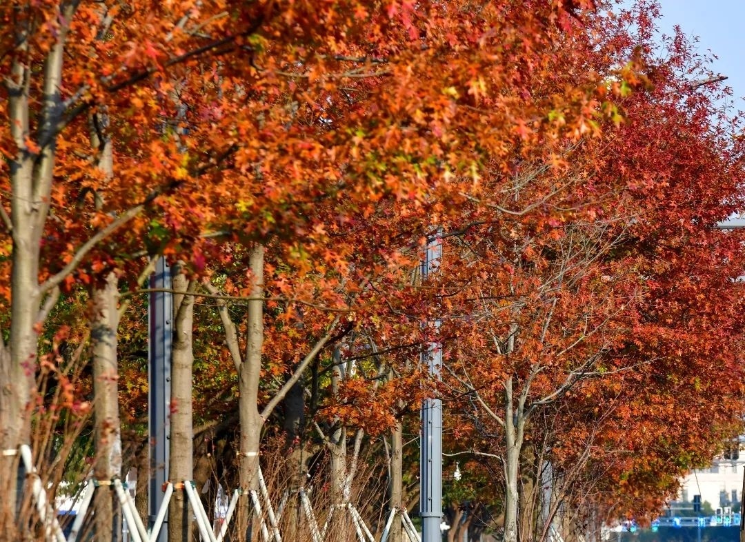 初冬时节,卫清西路和海汇街上的娜塔栎已转红,12月末则会全部变为深褐色、枯黄色等多种颜色,吸引着市民的目光。