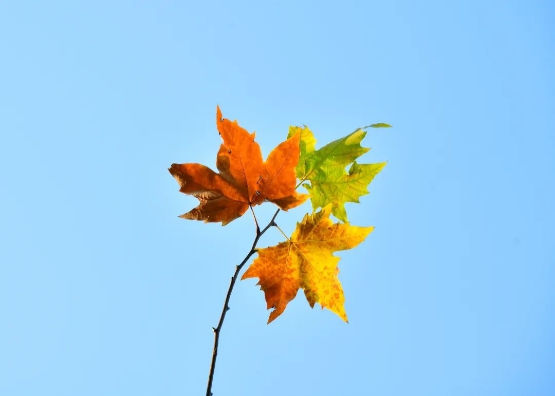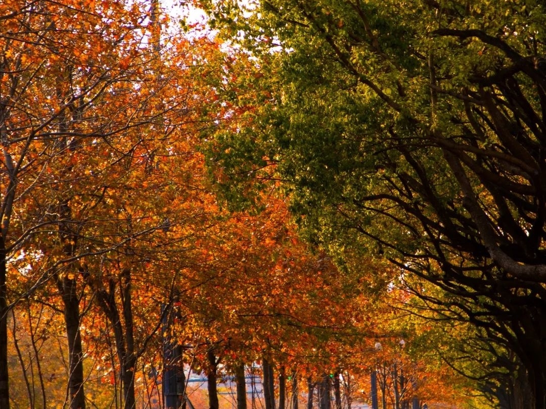 在大堤路上,无患子树形秀美、枝叶广展、落叶纷纷,阳光从树枝间洒下,在寒冬中带来暖意。