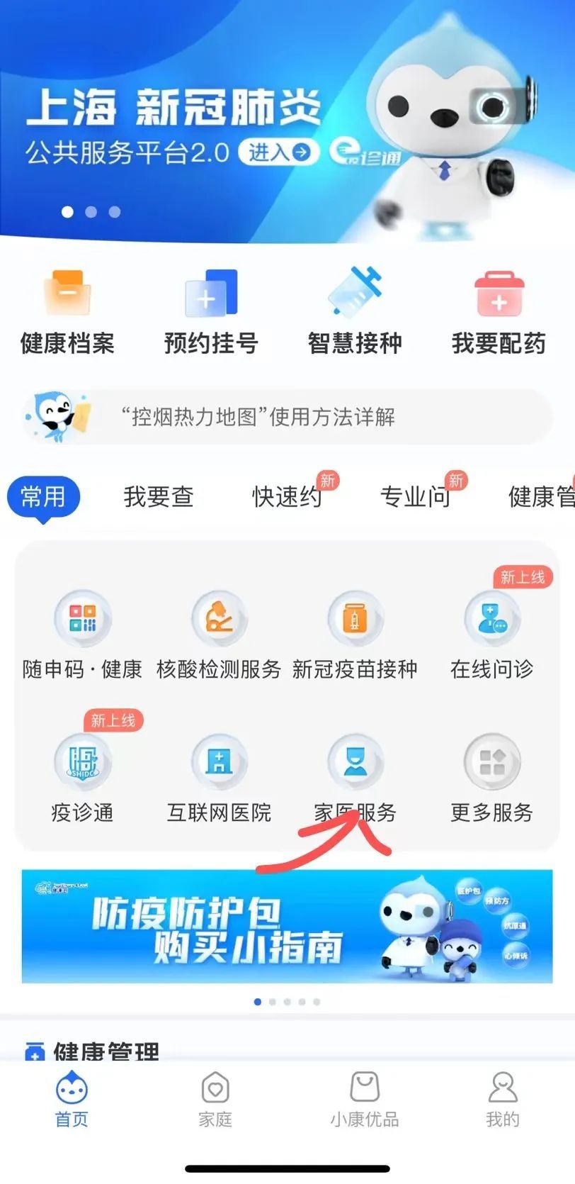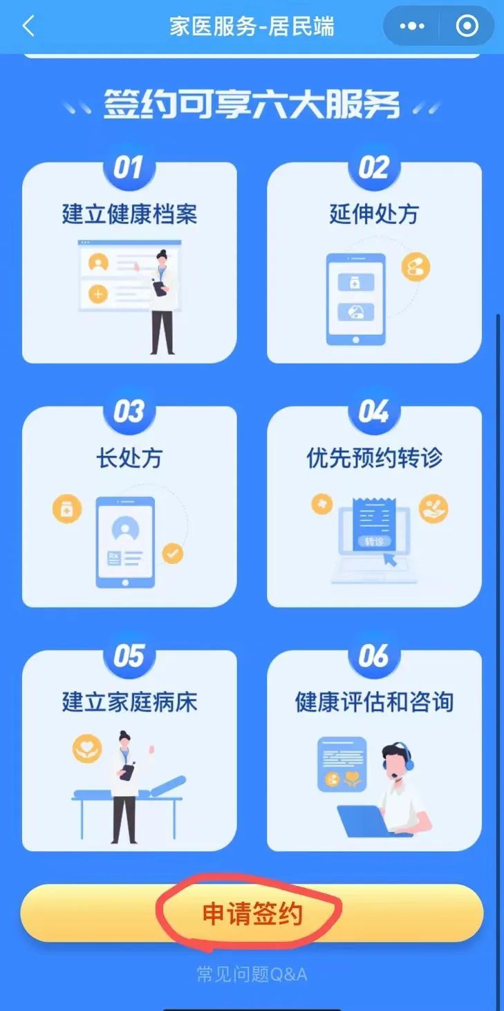 2、在APP或者小程序首页中找到“家医服务”,点击“申请签约”