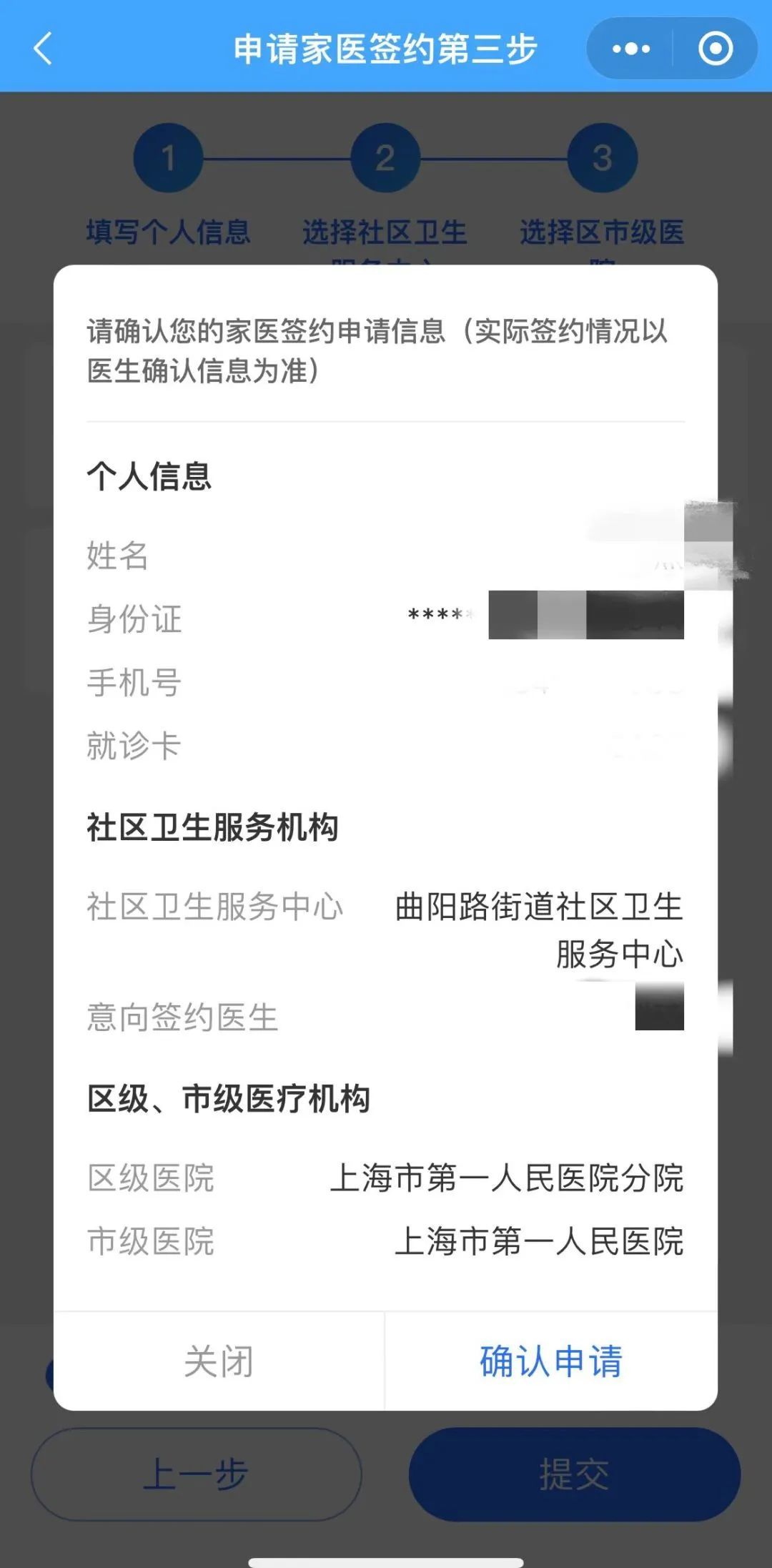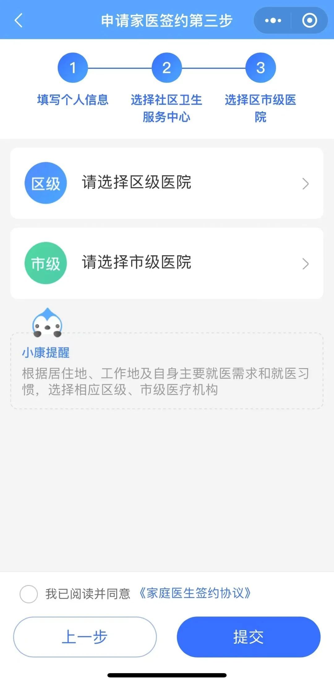 4、下一步可选择区市级医院,可根据医生推荐或自主进行选择,如不常就诊可以不选。阅读并同意协议后点击提交,二次确认家医签约申请信息,点击“确认申请”视为提交签约申请成功。