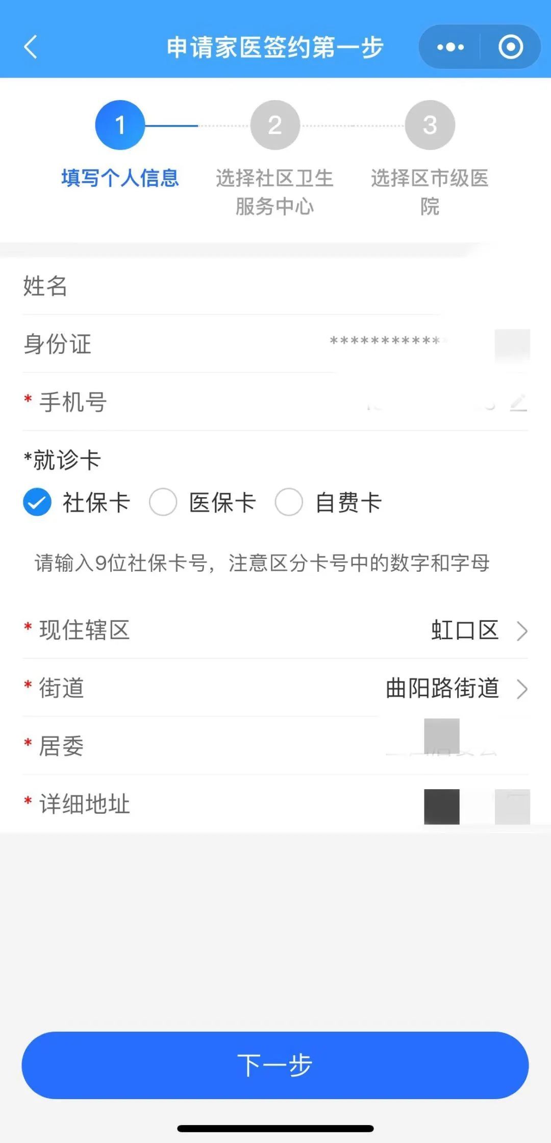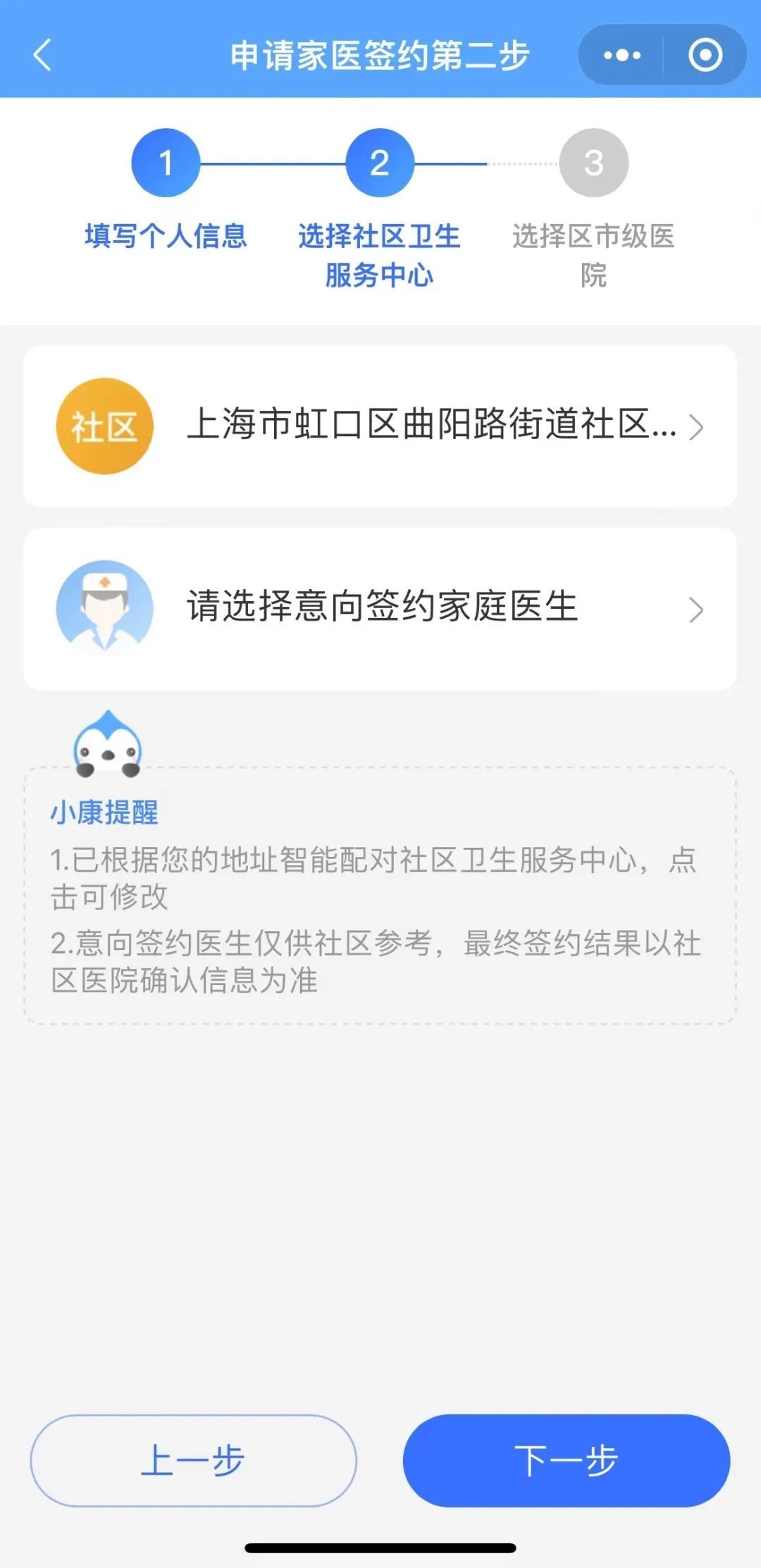 3、按要求填写个人信息后,点击下一步选择“社区卫生服务中心”和“意向签约家庭医生”