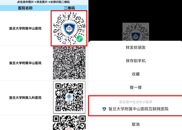 双击每个医院的二维码,查看原图后,长按识别二维码或保存二维码微信扫一扫,可登录互联网医院。