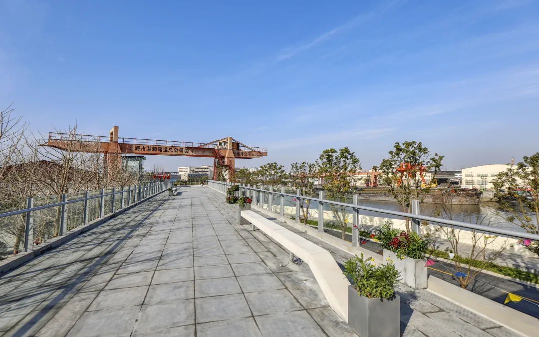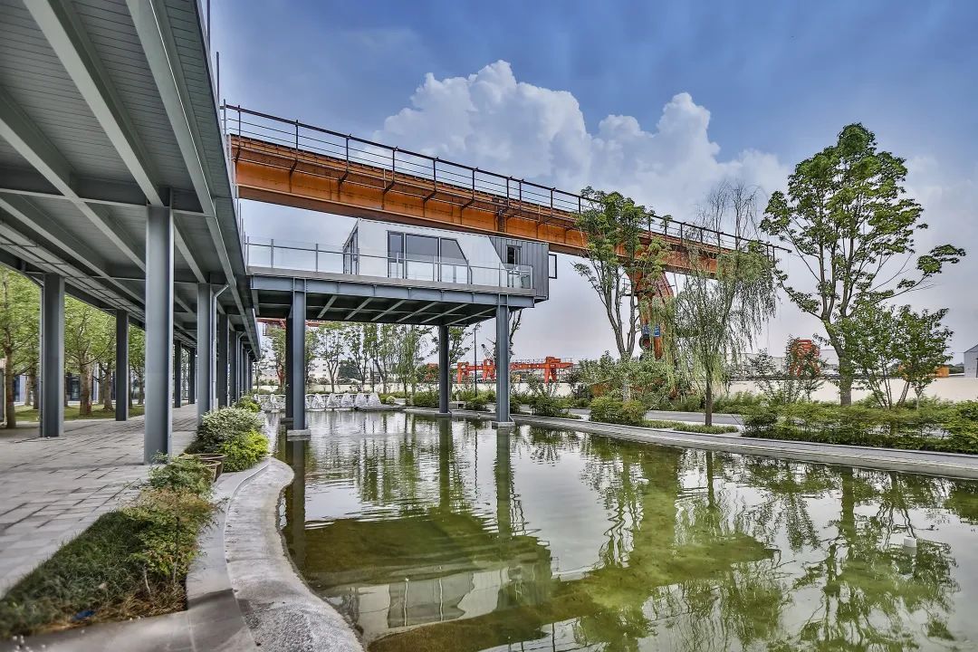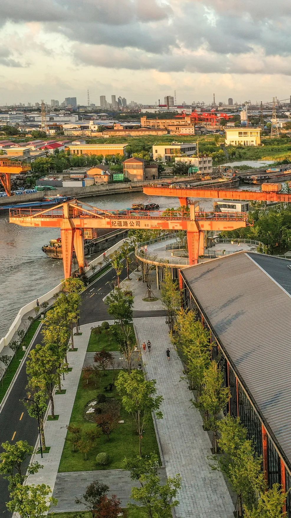 园区内拥有超1.2公里沿河岸线,依托工业原址保留的七个塔吊建造了上海首个星空高线公园,从空中俯瞰,七个龙门吊分布位置酷似北斗七星形状。