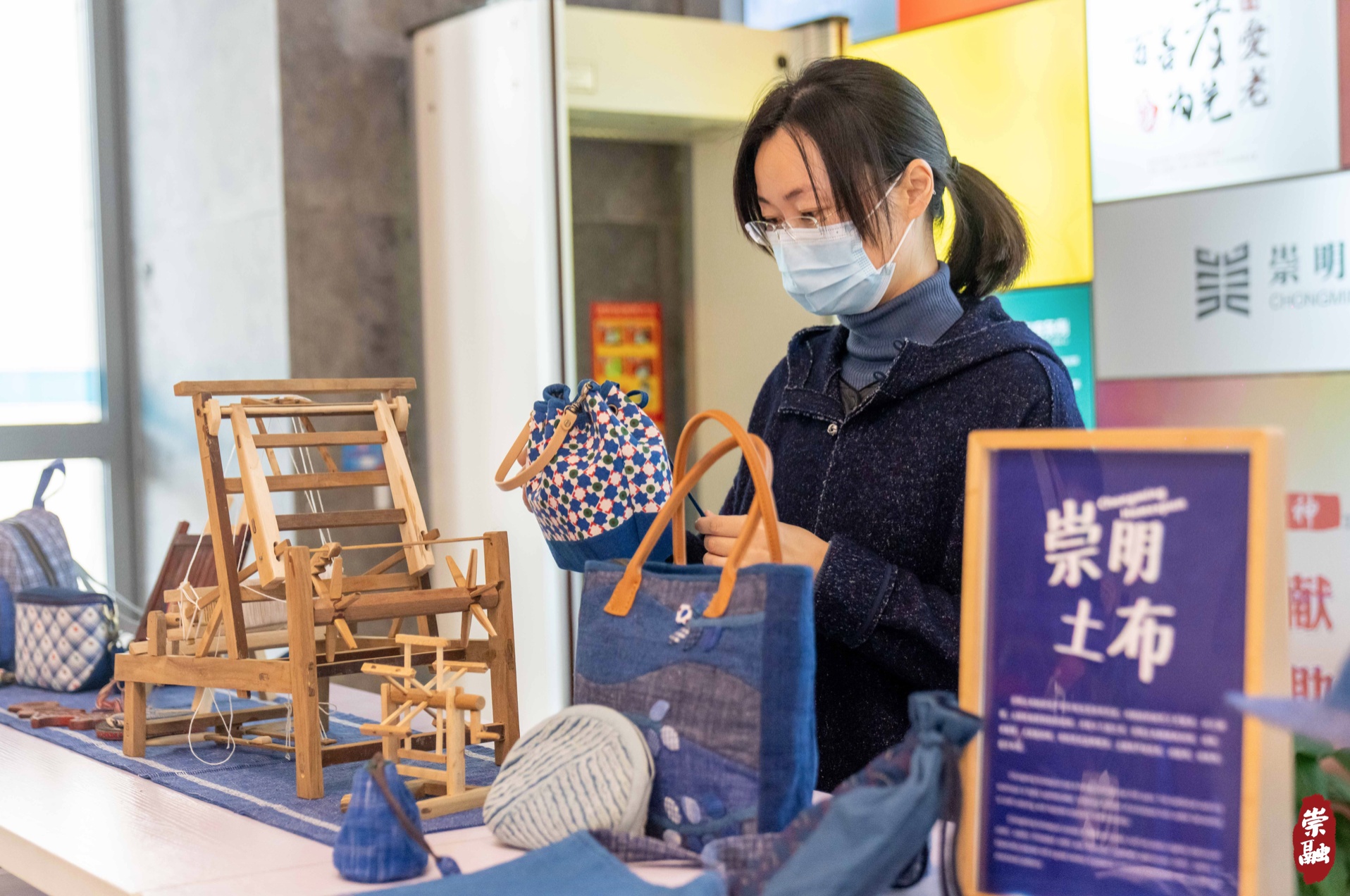 现场设立崇明土布展位,木棉花开创意工坊负责人宋荣耀带来土布帽子、土布茶包、土布文件袋等一系列文化产品,展现崇明非遗文化,让观众感受到中西融合之美。