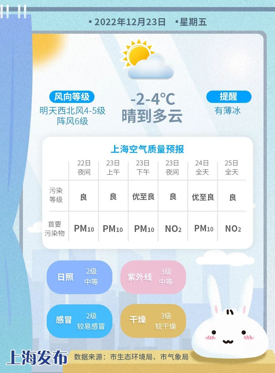 随着冷空气完全掌控我市,今天上海天空晴朗,早间由于辐射降温作用,气温继续向低点下探,中心城区最低气温-2度,有薄冰,郊区-5度到-3度,有冰冻或严重冰冻,白天阳光也只是起到装饰作用,气温上升困难,最高气温只有4度。这是本周最冷的白天了,风力依然不小,西北风4~5级阵风6级,沿江沿海地区风力更大,相对湿度60%~25%,天气寒冷,干燥明显大家务必做好保暖、多补水。