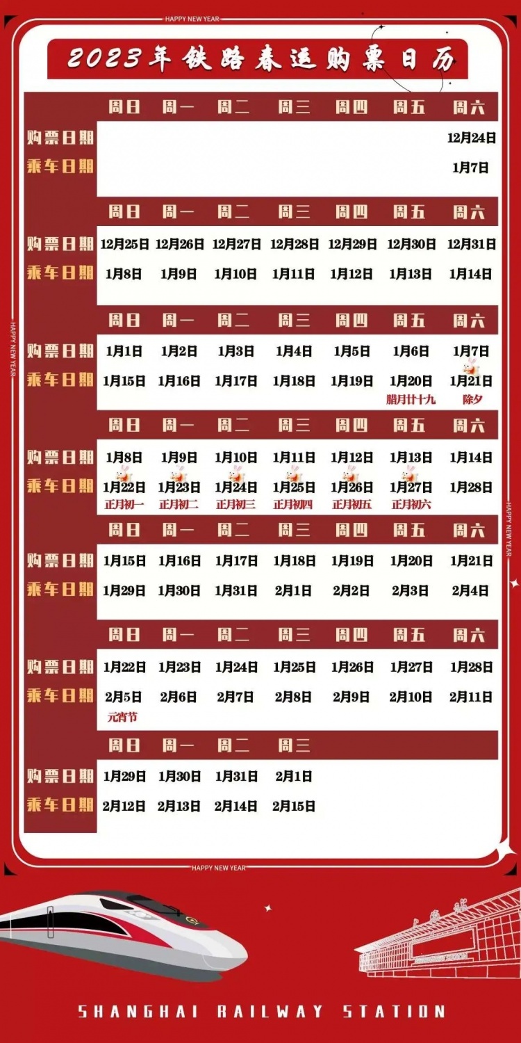 记者从铁路上海站获悉,从12月24日开始,2023年春运火车票就正式开售。12月24日,旅客就可购买2023年1月7日(春运首日)的火车票。