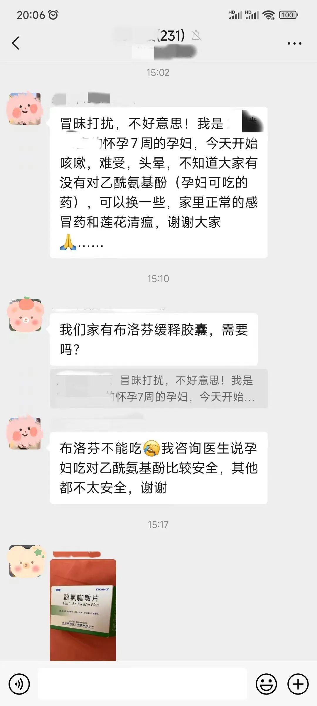 “冒昧打扰,我是怀孕7周的孕妇,今天开始咳嗽头晕,不知道大家有没有对乙酰氨基酚(孕妇可吃的药),可以换一些,我家里有感冒药和连花清瘟,谢谢大家!”家住华祺苑小区10号楼的一位孕妇在楼组群里发起求助。
