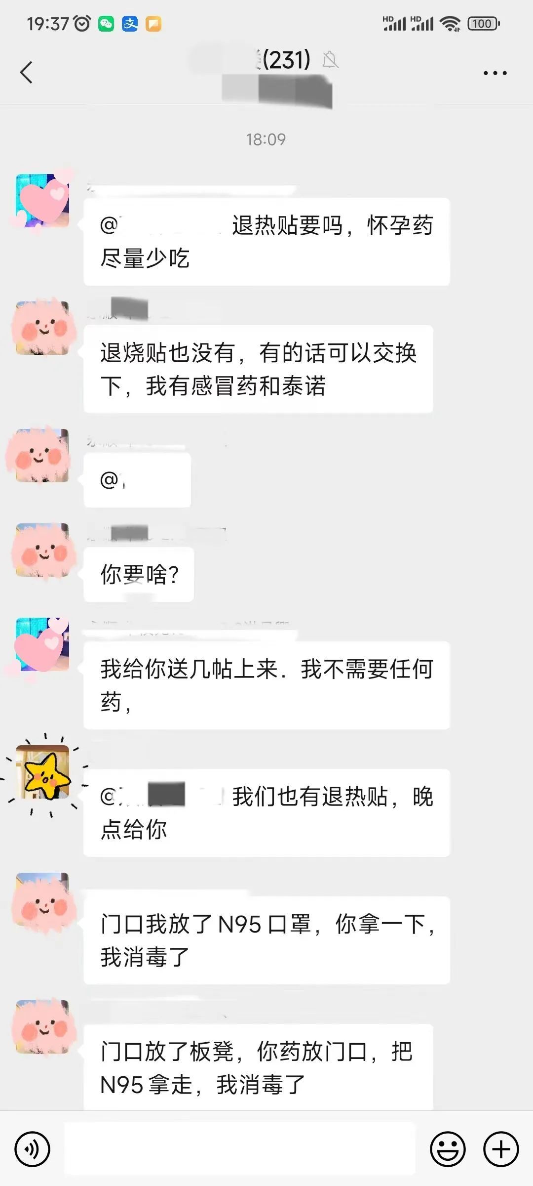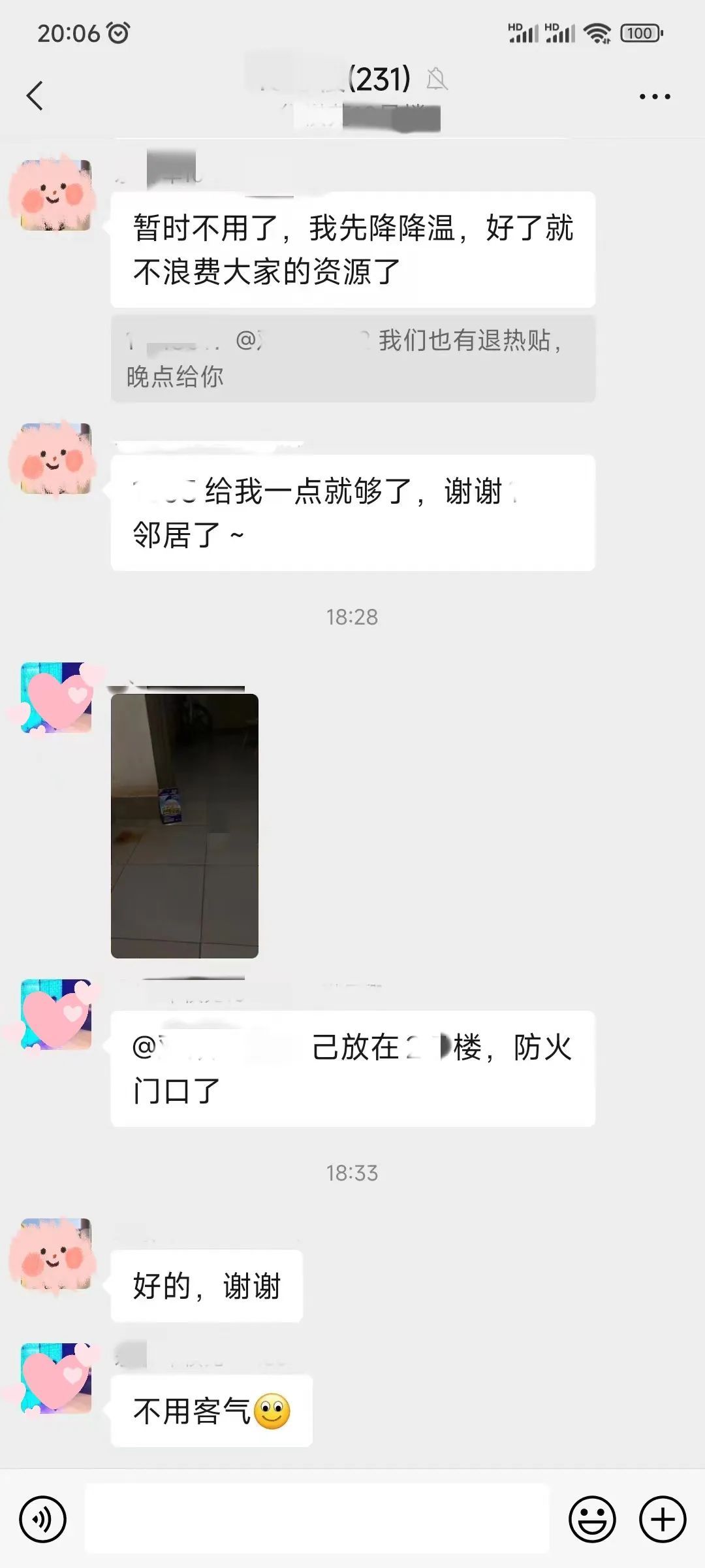 不到一分钟时间,群里邻居们的回复就此起彼伏:“我有退热贴,给你送去!”“我有药,放在你门口了。”大家纷纷在群里留言,尽己所能想帮助这位孕妈妈。