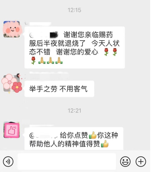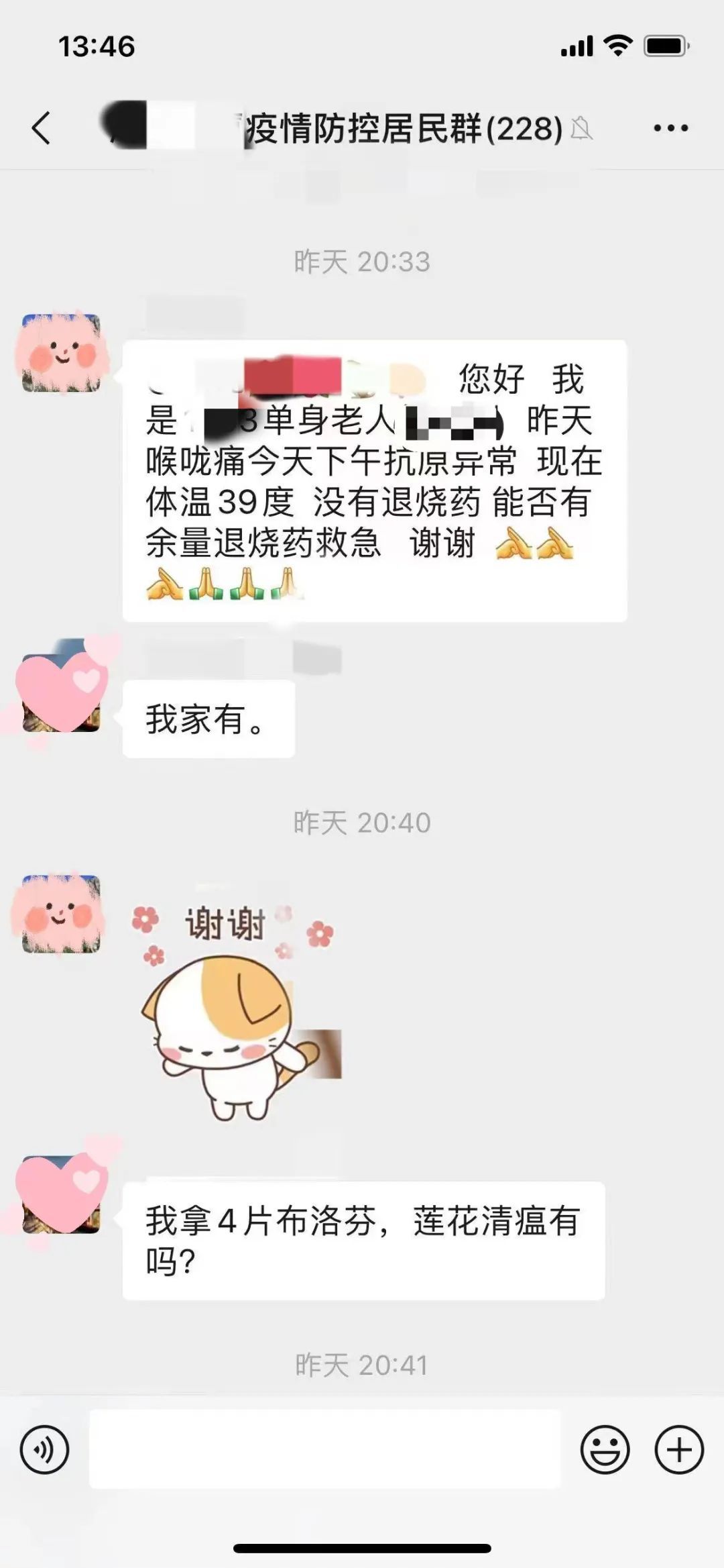 与此同时,住在鸿波大厦的独居老人楼老,在居民群里求助退烧药,很快,住在8楼的小张便将布洛芬送到楼老的家门口。为了方便楼老服药,小张还在群里详细说明了用药剂量和注意事项等。第二天,楼老在群里对邻居的善举表达感谢:“真的感谢您的爱心,我后半夜就退烧了,谢谢你们的分享。”