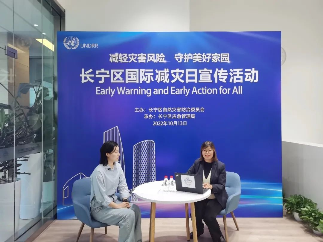 在今年的长宁区国际减灾日宣传活动中,潘雨婷(左)担任直播主持人