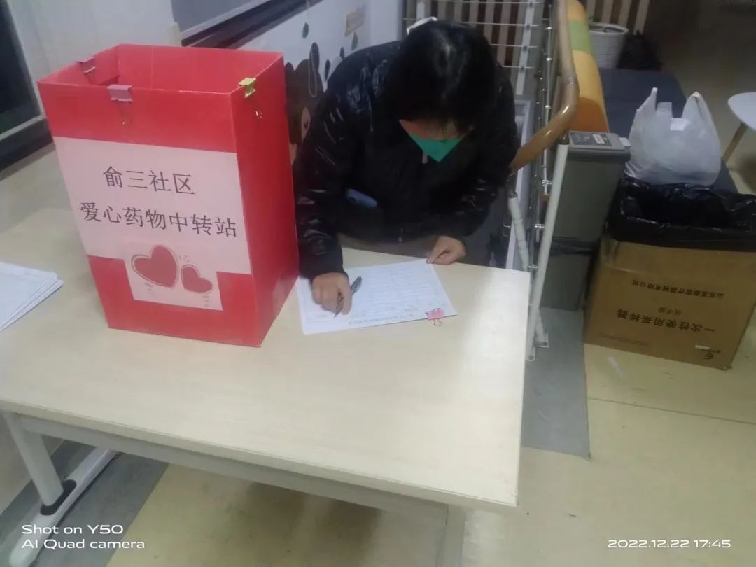 最终,倡议书在22日下午顺利发布。同时,居委会门口摆放出了一个贴着“爱心”和“俞三社区爱心药物中转站”字样的大红色纸箱,供大家投放药品。