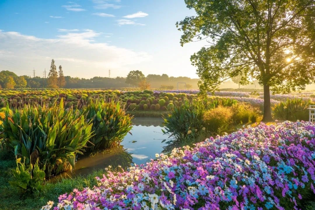 花开海上生态园位于上海市金山区朱泾镇西侧,北邻风景秀美的秀州塘,是融合科普、展示、观赏游览于一体的赏花主题公园。公园占地1234亩,由花海、梅园、秋景园、芳香花园四大园区组成。