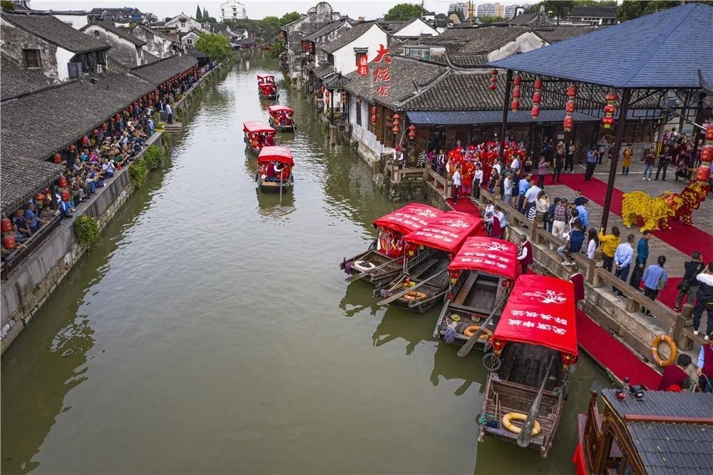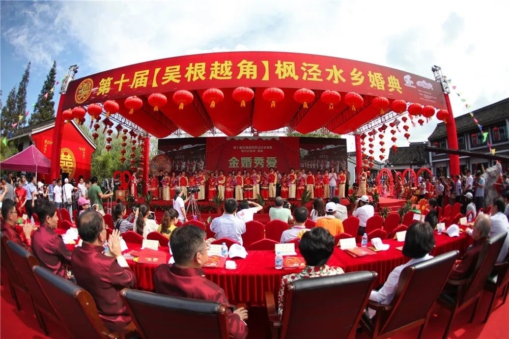 一年一度的水乡婚典,使枫泾古镇成为喜气祥和的圣地,届时街道张灯结彩、锣鼓喧天、礼炮齐鸣,河道彩船繁忙穿梭,一对对新人身穿传统婚服,沿袭传统的婚典仪式、在历史和现代的场景中穿梭,吸引了数万市民游客争相观赏,可谓“闻风而来、倾室往观、车驾云集、路塞不通、万人空巷、盛况空前”,成了水乡古镇一道亮丽的风景线。