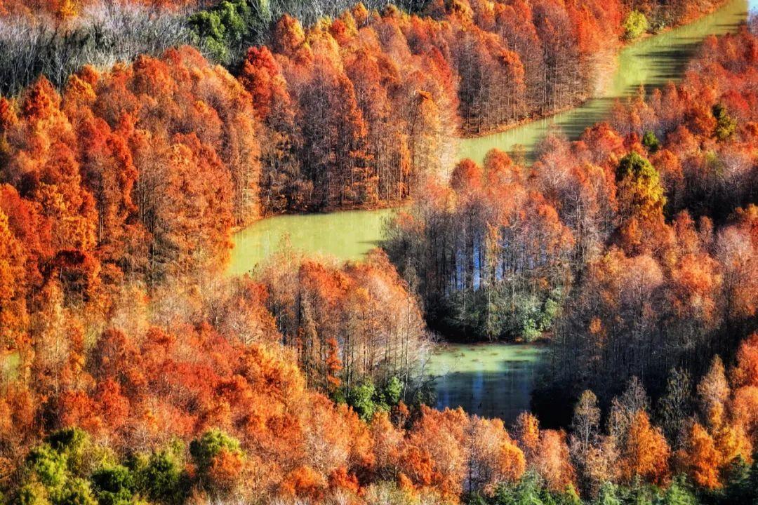 漫步在红杉林中,仿佛置身于童话世界。落叶随着风走遍山野,为土地铺上松软的厚毯子。树上的叶子也被吹得此起彼伏,如海浪般层层叠叠。丰富的水景是这里灵动的灵魂,乘船徜徉在这片诗意的河流,两岸的红杉像勇敢的守卫,沉默而坚定地伫立着。阳光柔柔,微风轻轻,在清澈的湖面划出一道道闪烁着金光的波纹。