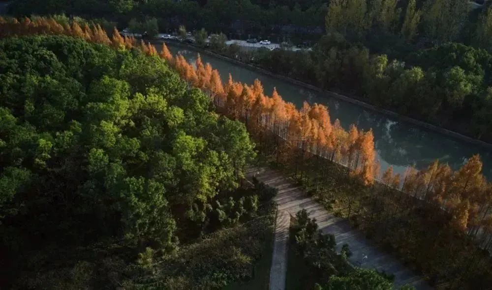 此时正是园内水杉变红的最佳时刻,透过窗户看水杉林,大红、深棕、浓绿层层晕染的变幻。