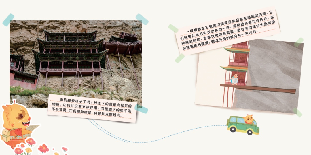 刚看到悬空寺,人们常常会被建筑下方的柱子迷惑,认为那些细长的立柱支撑了整座建筑。但是透过表象看建筑,其实悬空寺能在崖壁上站立不倒的原因在于特殊的“横梁台基”构造。什么是“横梁台基”?在《悬空寺的秘密》这本书里,会为你一一解答!