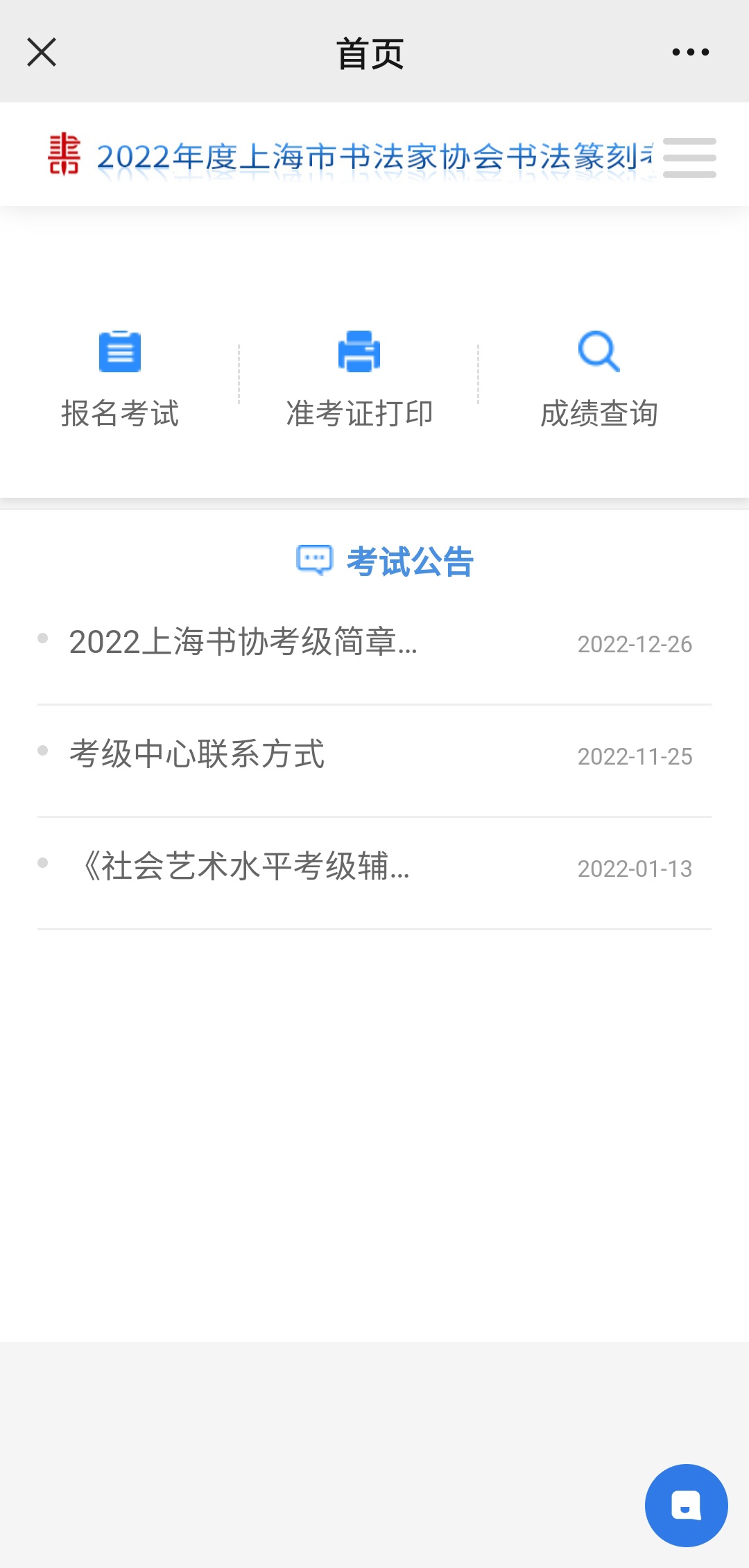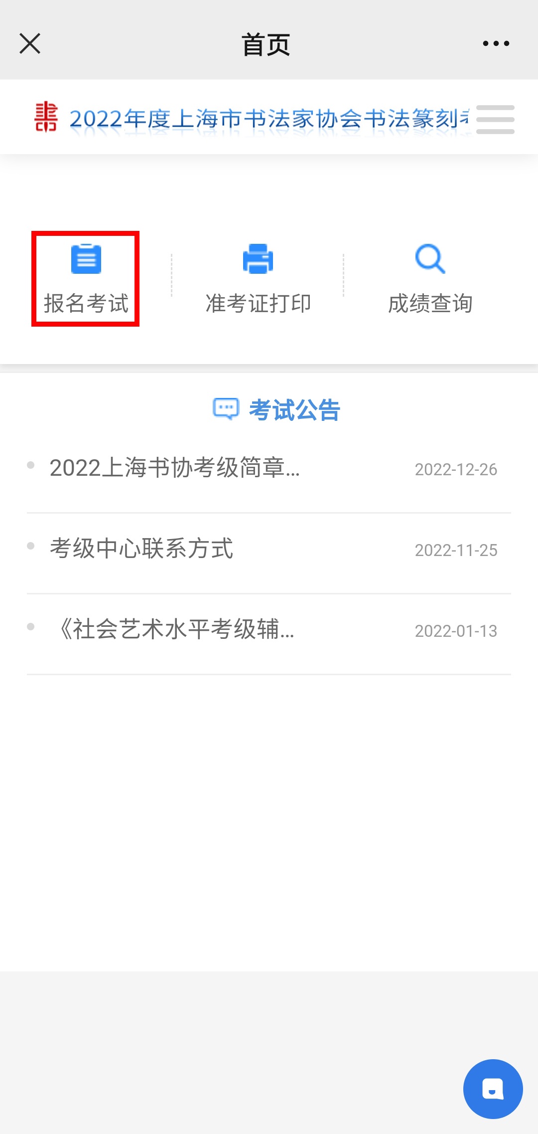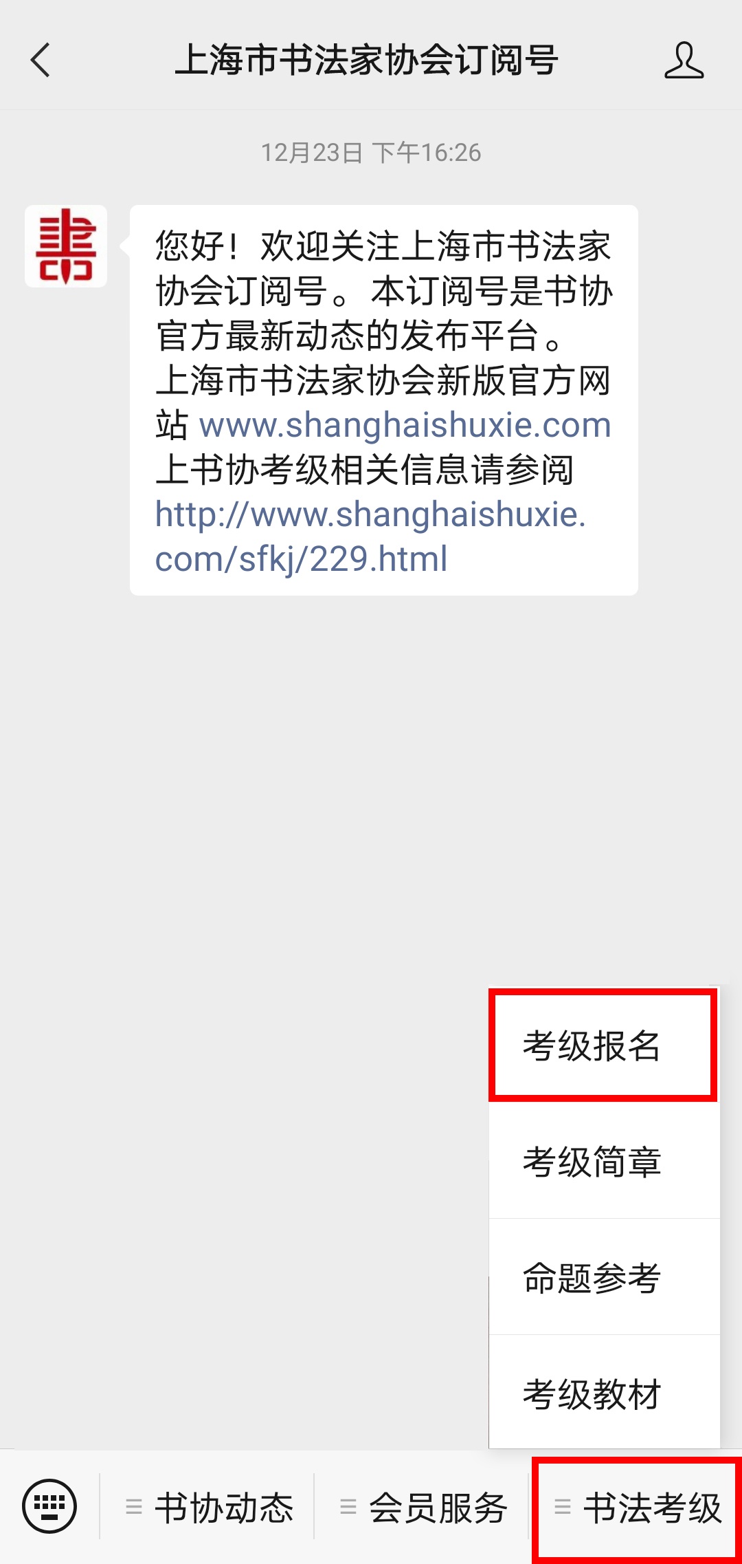 报名时间开启(2022年12月28日00:00)后,关注“上海市书法家协会微信订阅号“,进入“书法考级”,选择“考级报名”。