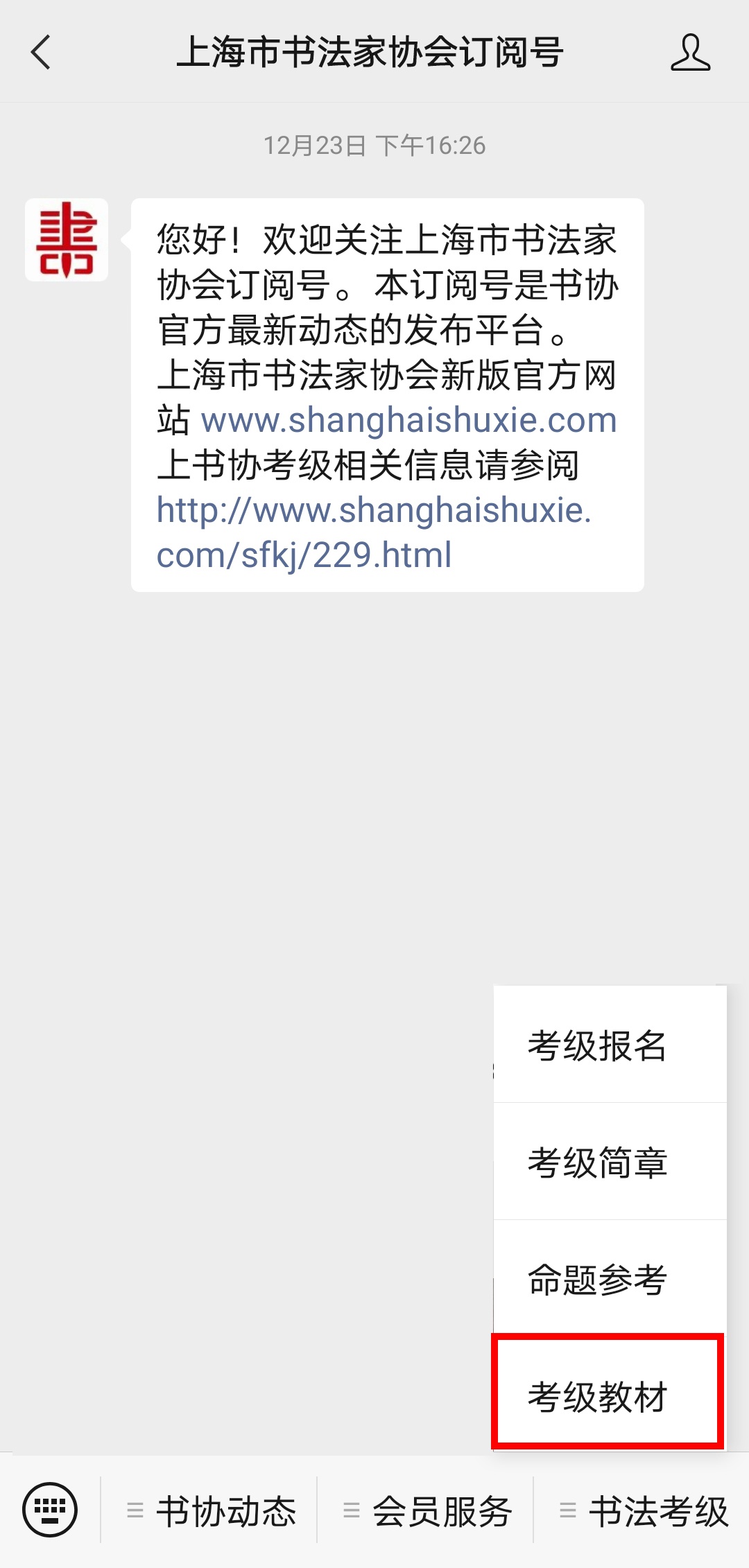 购买方法:进入“上海市书法家协会订阅号”中的“书法考级”菜单里面的“考级教材”