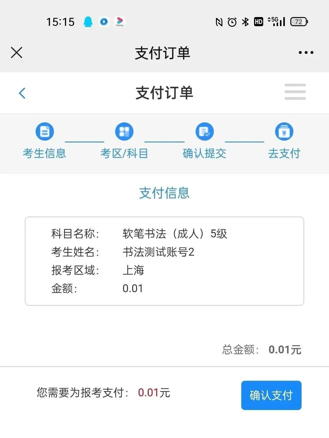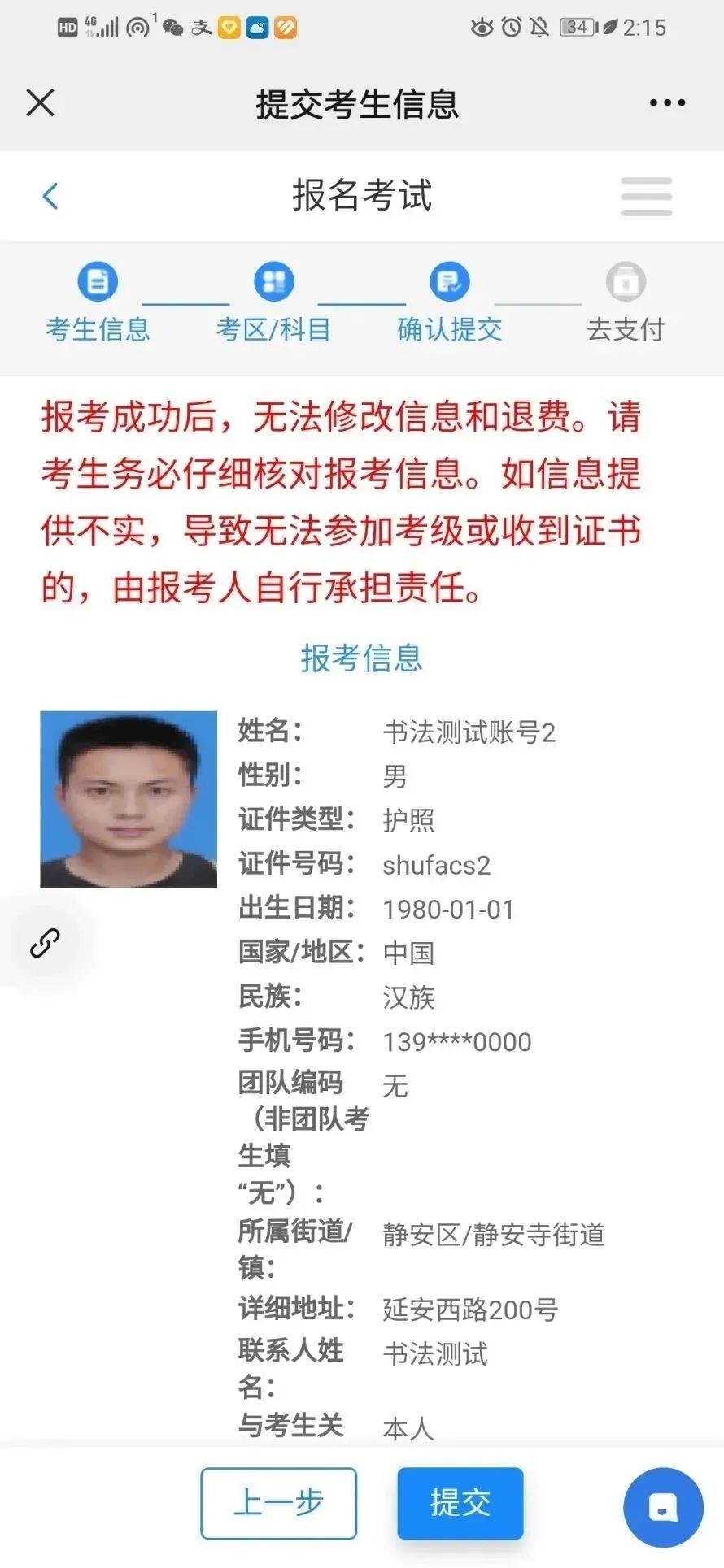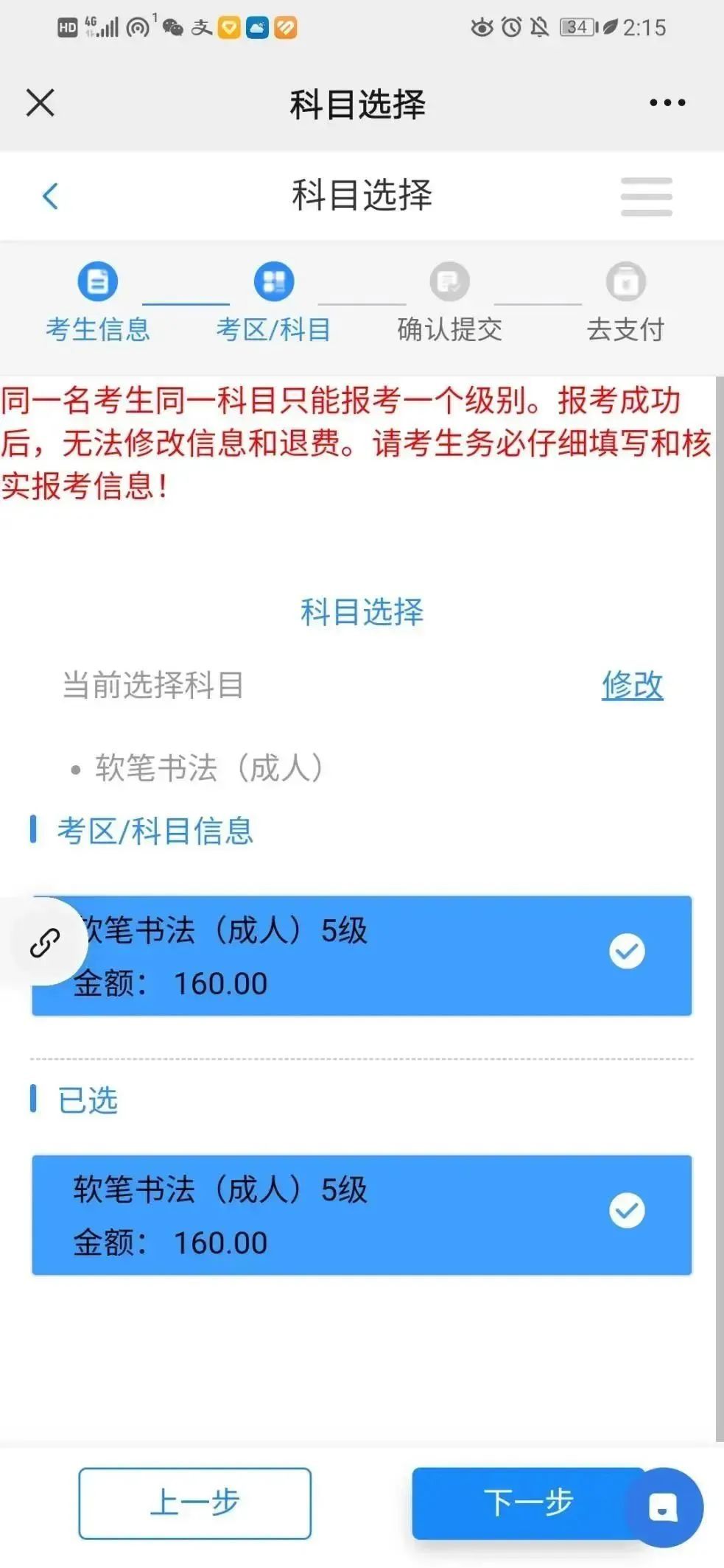 请务必确认本次的报考科目及级别的准确性再提交,一旦提交,考生将不可再修改!