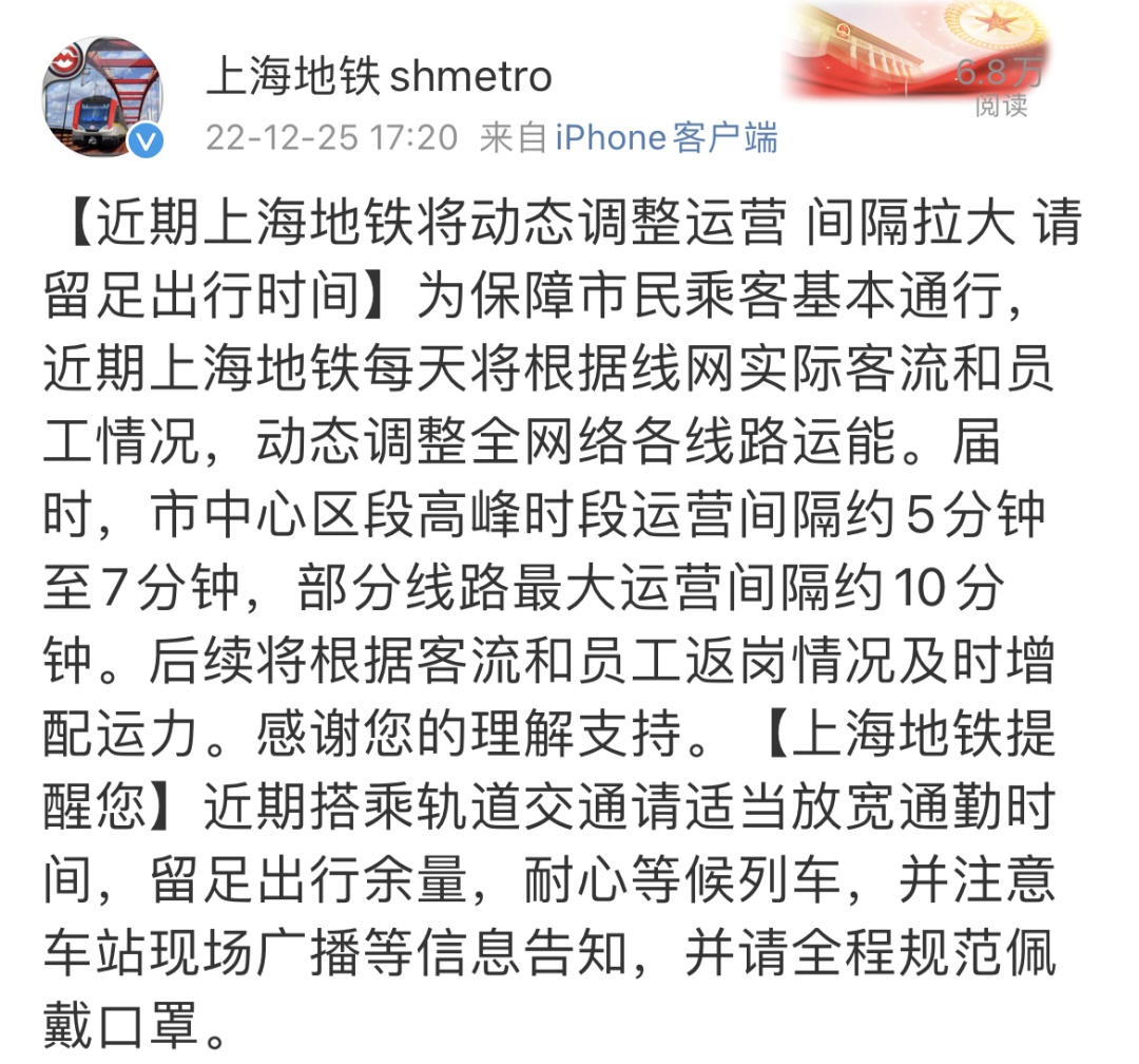 申通地铁集团表示:近期上海地铁每天将根据线网实际客流和员工情况,动态调整全网络各线路运能。届时,市中心区段高峰时段运营间隔约5分钟至7分钟,部分线路最大运营间隔约10分钟。由于运营间隔拉大,乘客要留足出行时间。上海地铁还表示,后续将会根据客流和员工返岗情况及时增配运力。