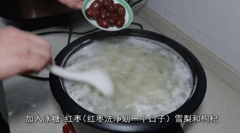 4. 熬至20分钟左右,汤汁有些浓稠时,加入冰糖、红枣(洗净划口)、雪梨和枸杞。